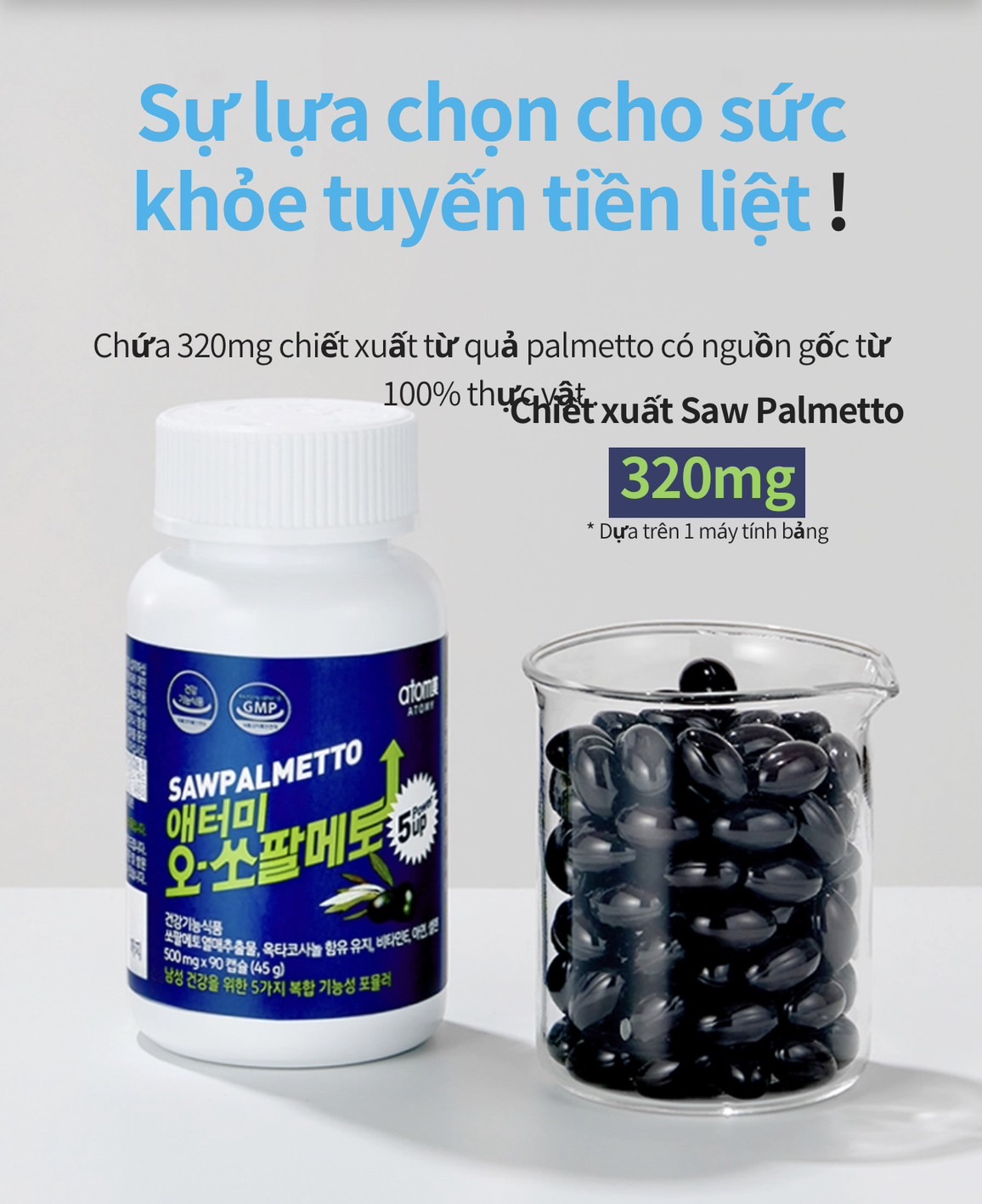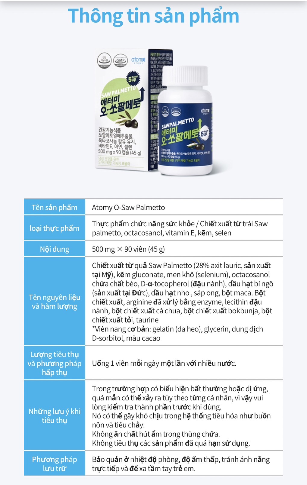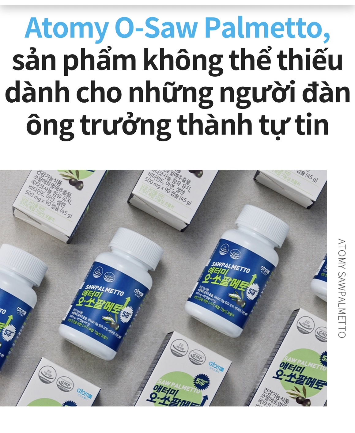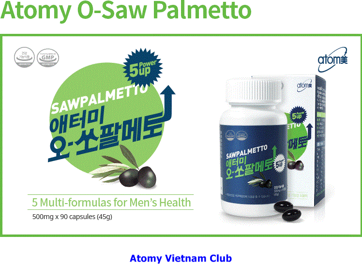 - Atomy Saw Palmetto được chiết xuất từ cây cọ lùn Bắc Mỹ, có thành phần gồm lipid, axit béo, Phytosterol, Flavonoids và Polysaccharide, những chất này có vai trò quan trọng trong việc chống co thắt, chống viêm sưng, lợi tiểu và đặc biệt có thể giúp điều trị phì tiền liệt tuyến.