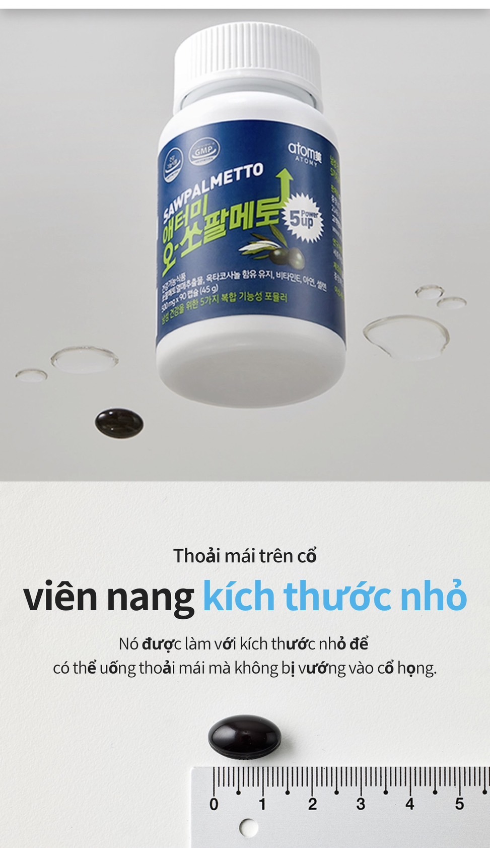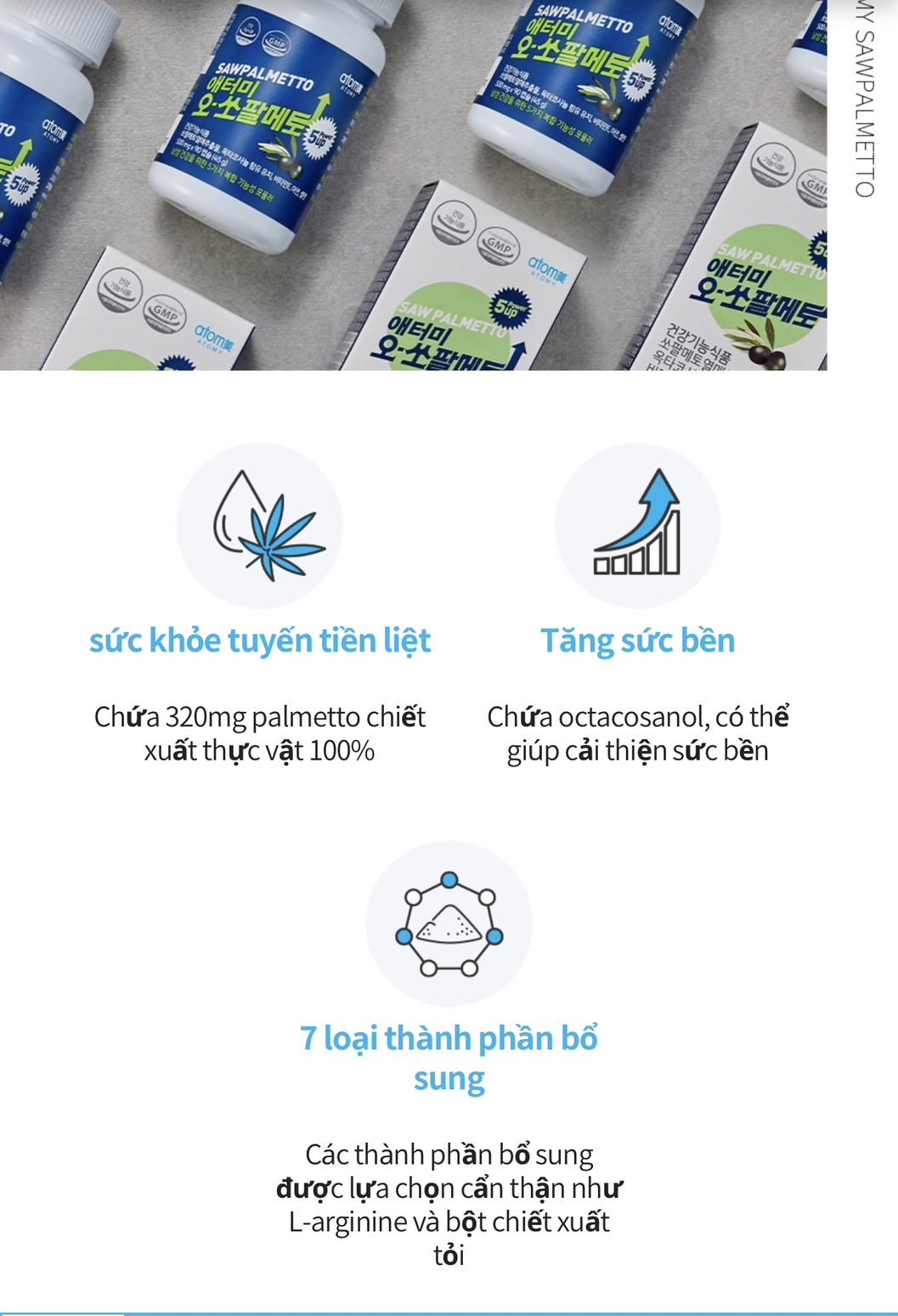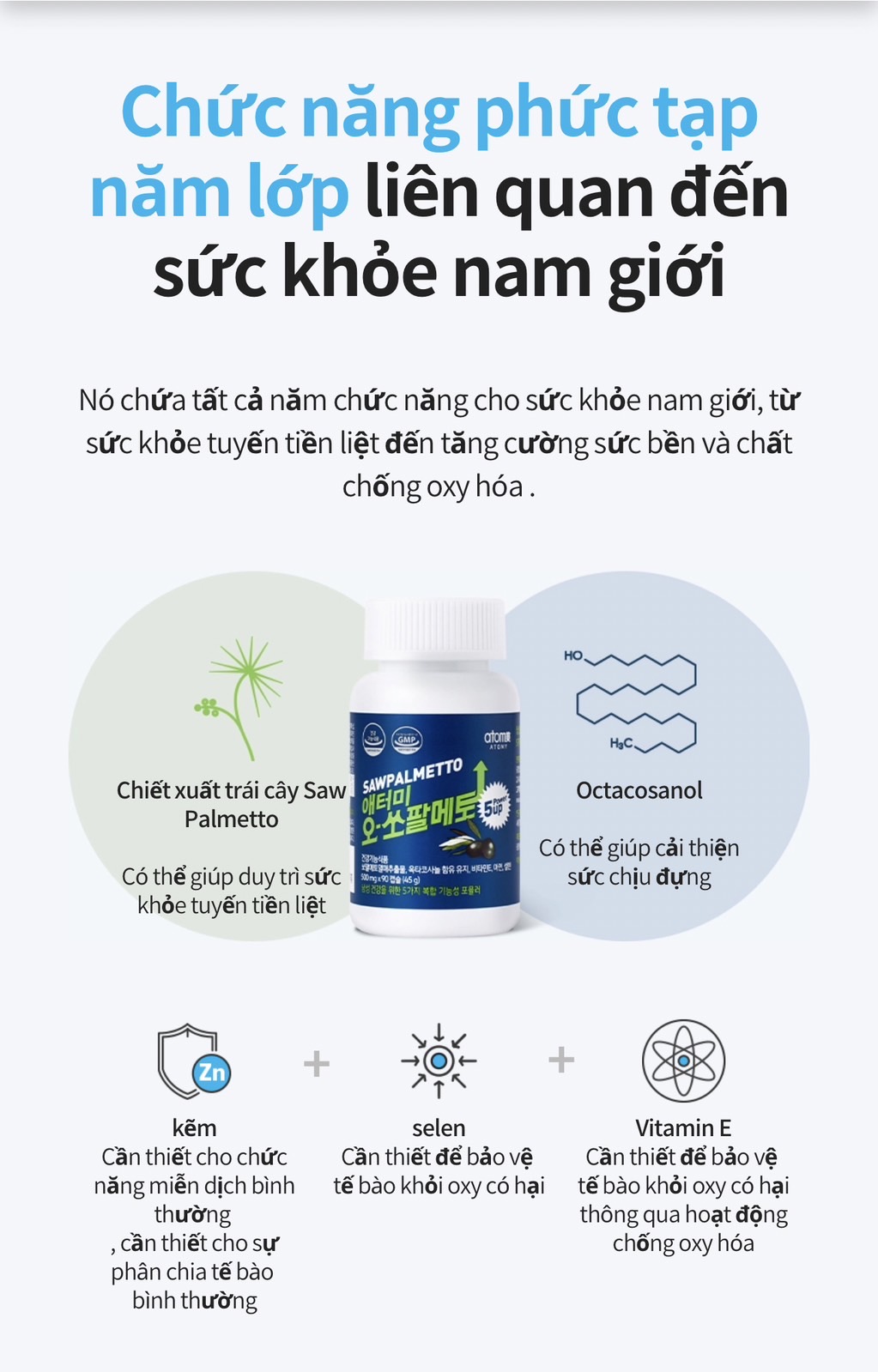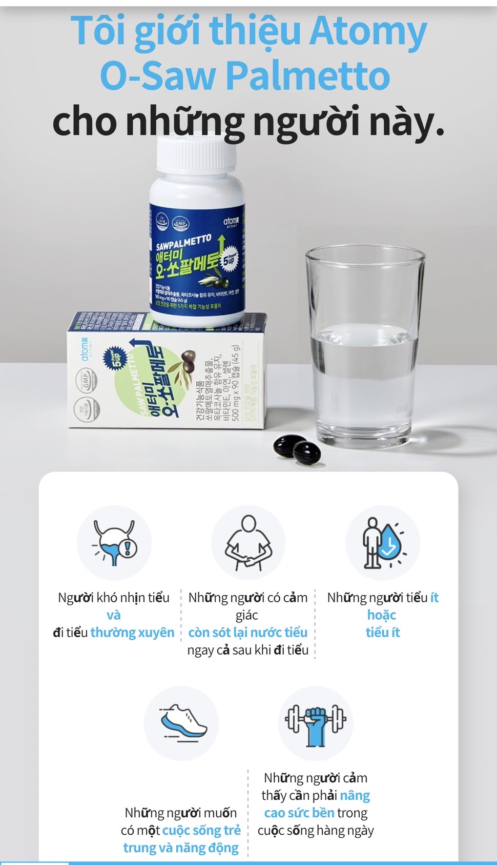 - Atomy Saw Palmetto được chiết xuất từ cây cọ lùn Bắc Mỹ, có thành phần gồm lipid, axit béo, Phytosterol, Flavonoids và Polysaccharide, những chất này có vai trò quan trọng trong việc chống co thắt, chống viêm sưng, lợi tiểu và đặc biệt có thể giúp điều trị phì tiền liệt tuyến.