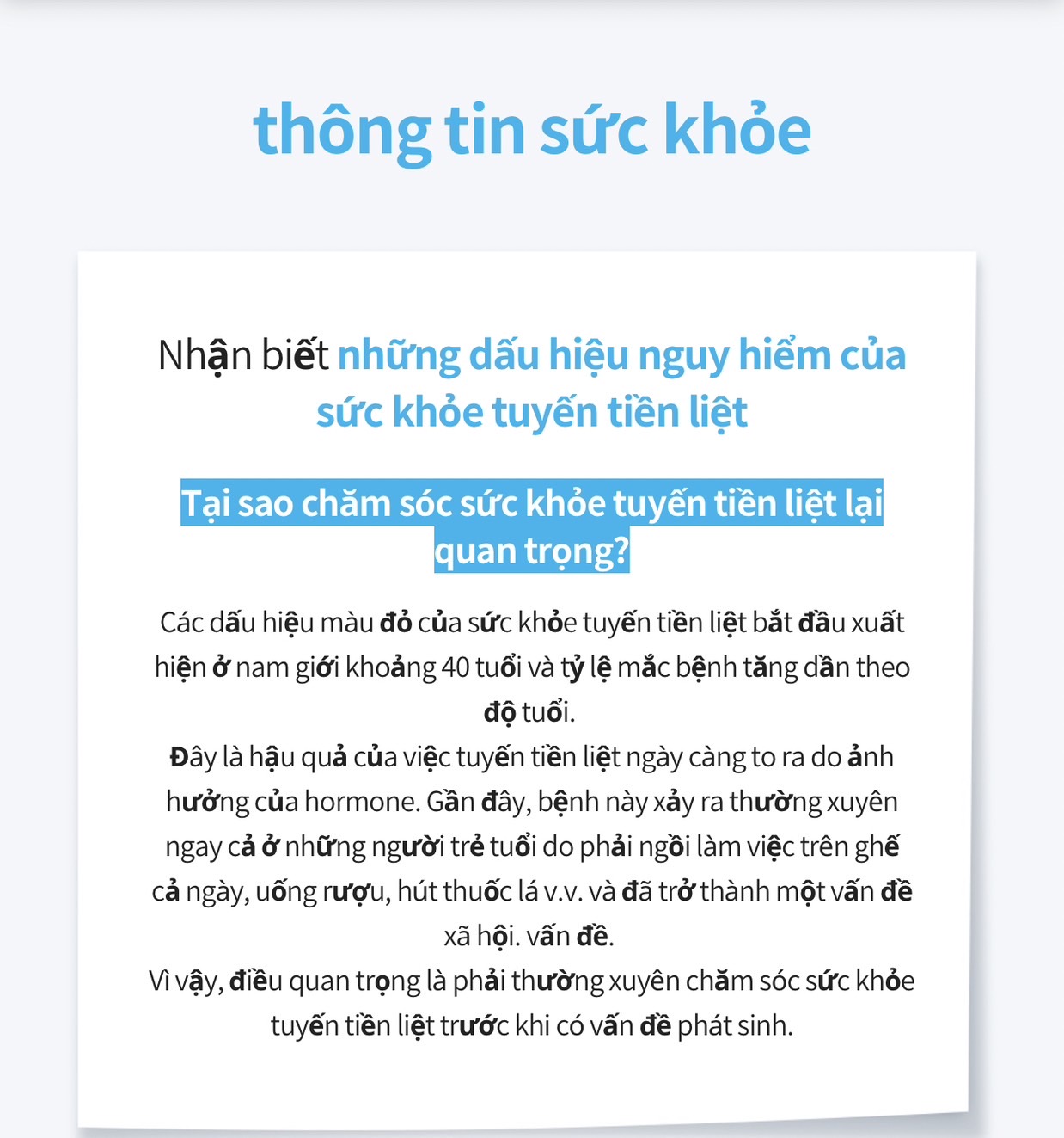 Hỗ trợ điều trị bệnh phì đại tiền liệt tuyến lành tính. Cải thiện rõ rệt các triệu chứng: tiểu khó, tiểu gắt, tia nước tiểu yếu, đi tiểu đêm nhiều lần ở Nam giới trung niên trở lên.
