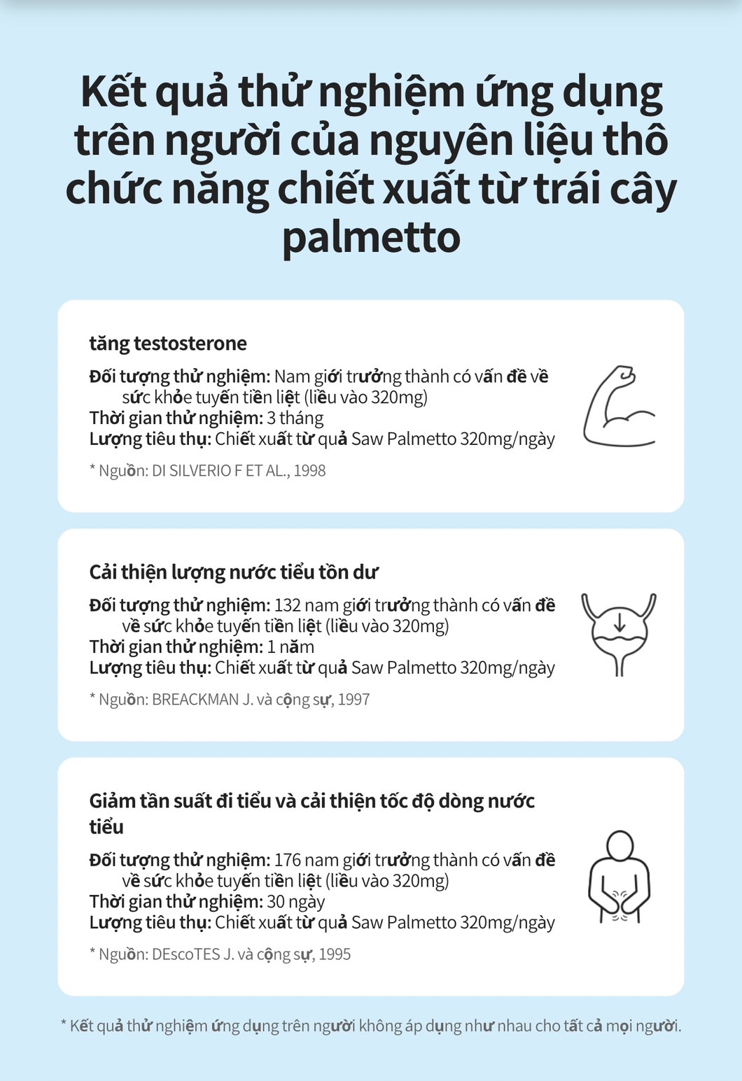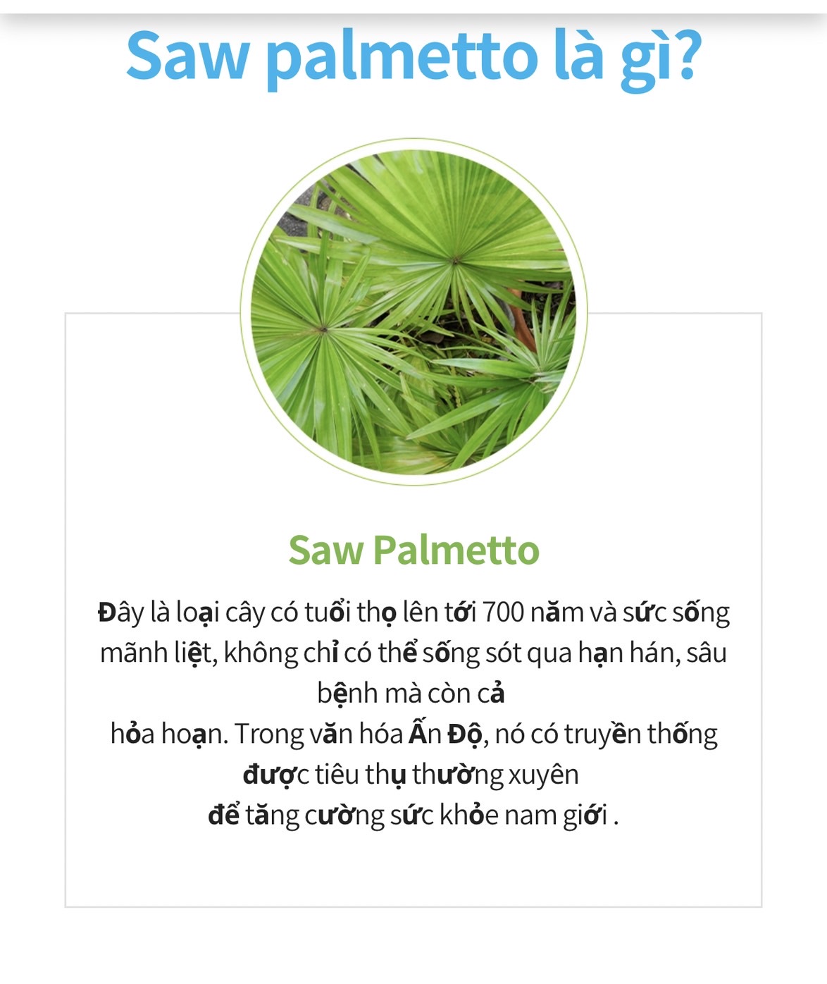 - Ngoài ra, Saw Palmetto còn đem lại nhiều lợi ích khác cho sức khỏe nói chung như điều trị cảm, cúm, đau họng, hen suyễn, viêm phế quản mãn tính, hội chứng đau khung xương chậu mãn tính, chứng đau nửa đầu.