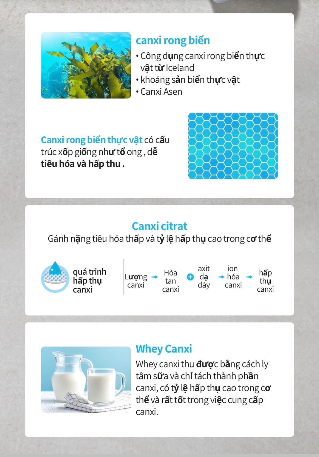 Được chiết xuất từ tảo đỏ, canxi ván sữa và Calcium Citrate bổ sung Vitamin D, Vitamin K, Magie, mangan, đồng, kẽm đảm bảo cho cơ thể đến 70% / ngày.