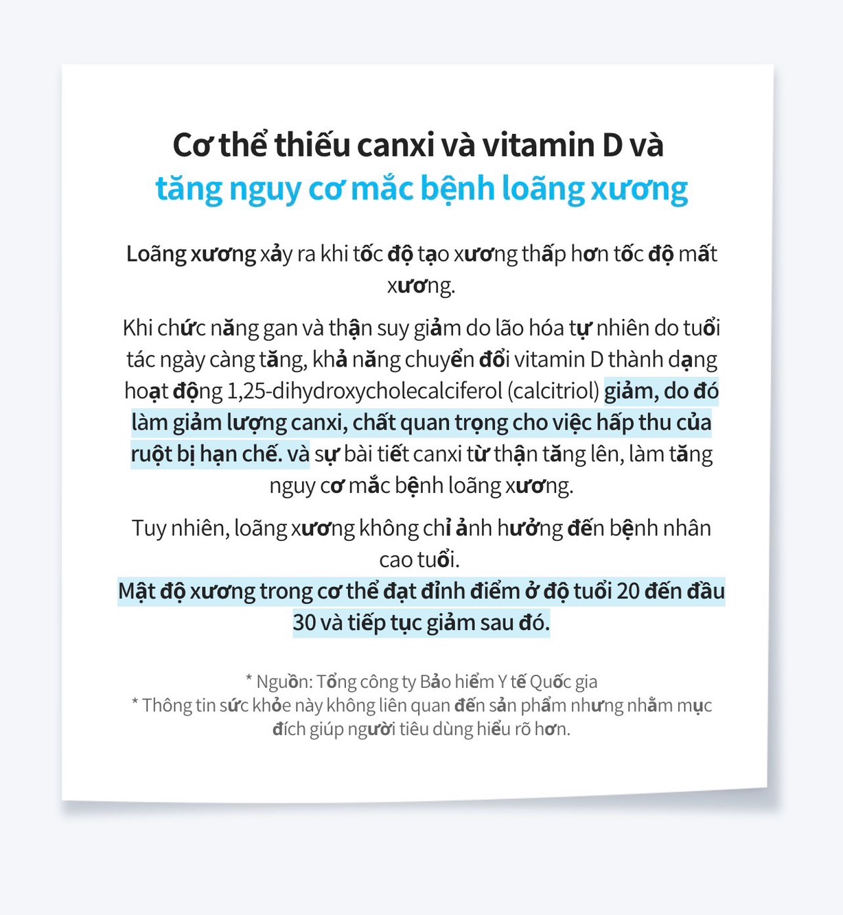 - Canxi giúp xương chắc khỏe, phòng ngừa những bệnh loãng xương, giảm tình trạng đau nhức và khó khăn trong vận động, làm nhanh lành các vết nứt gãy trên xương.