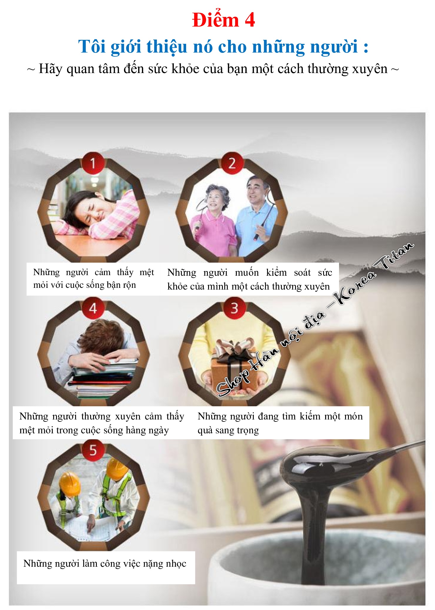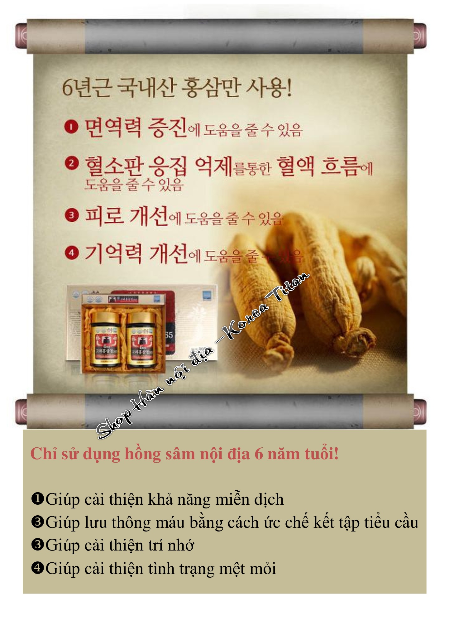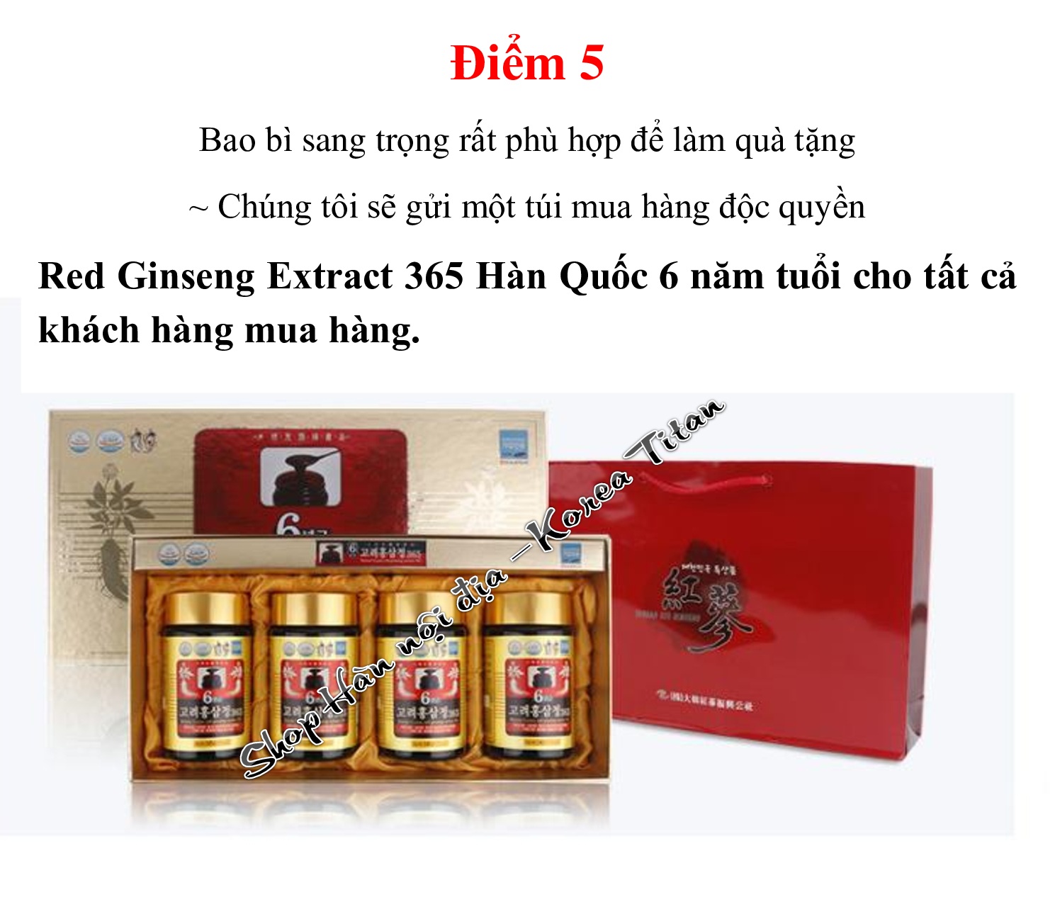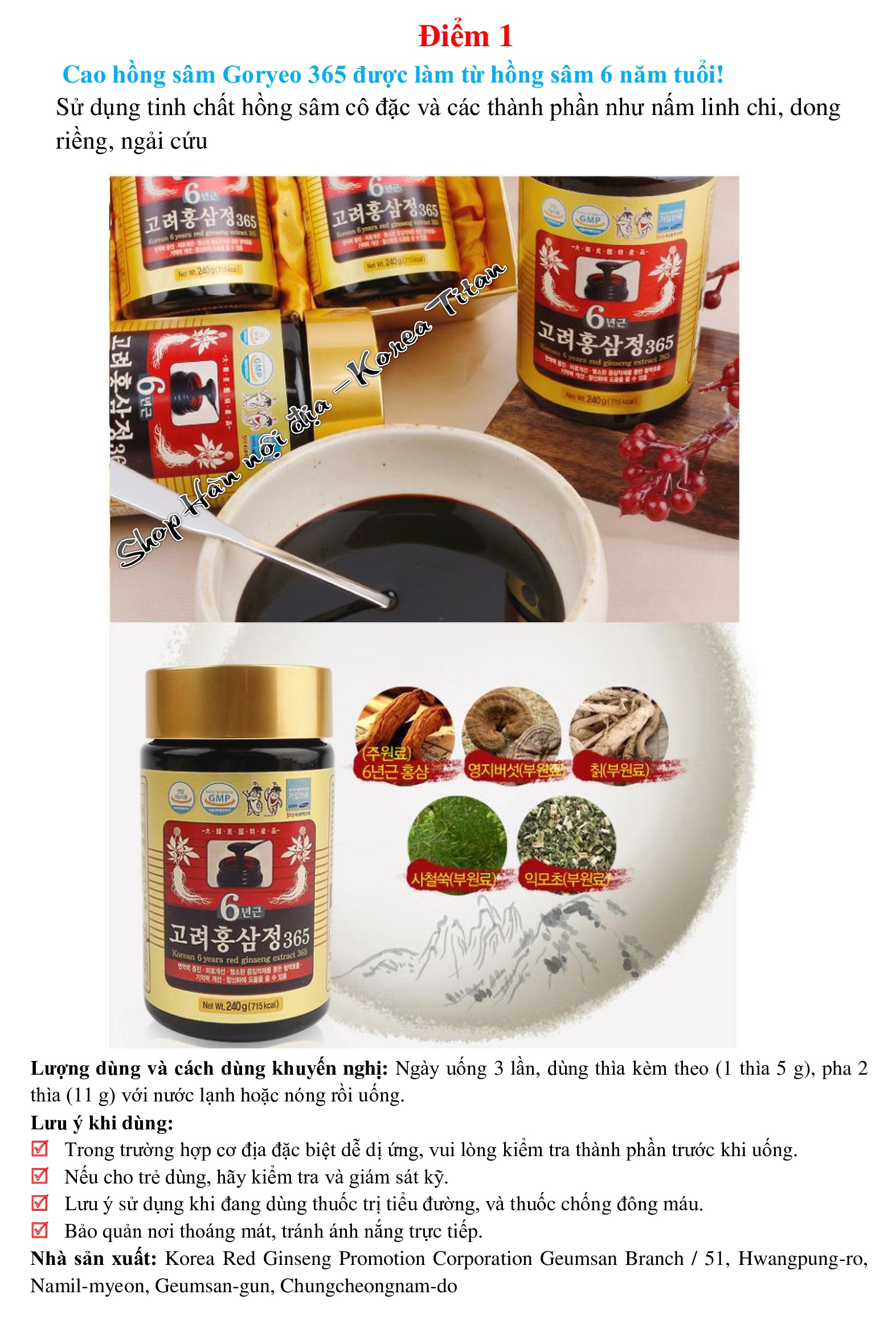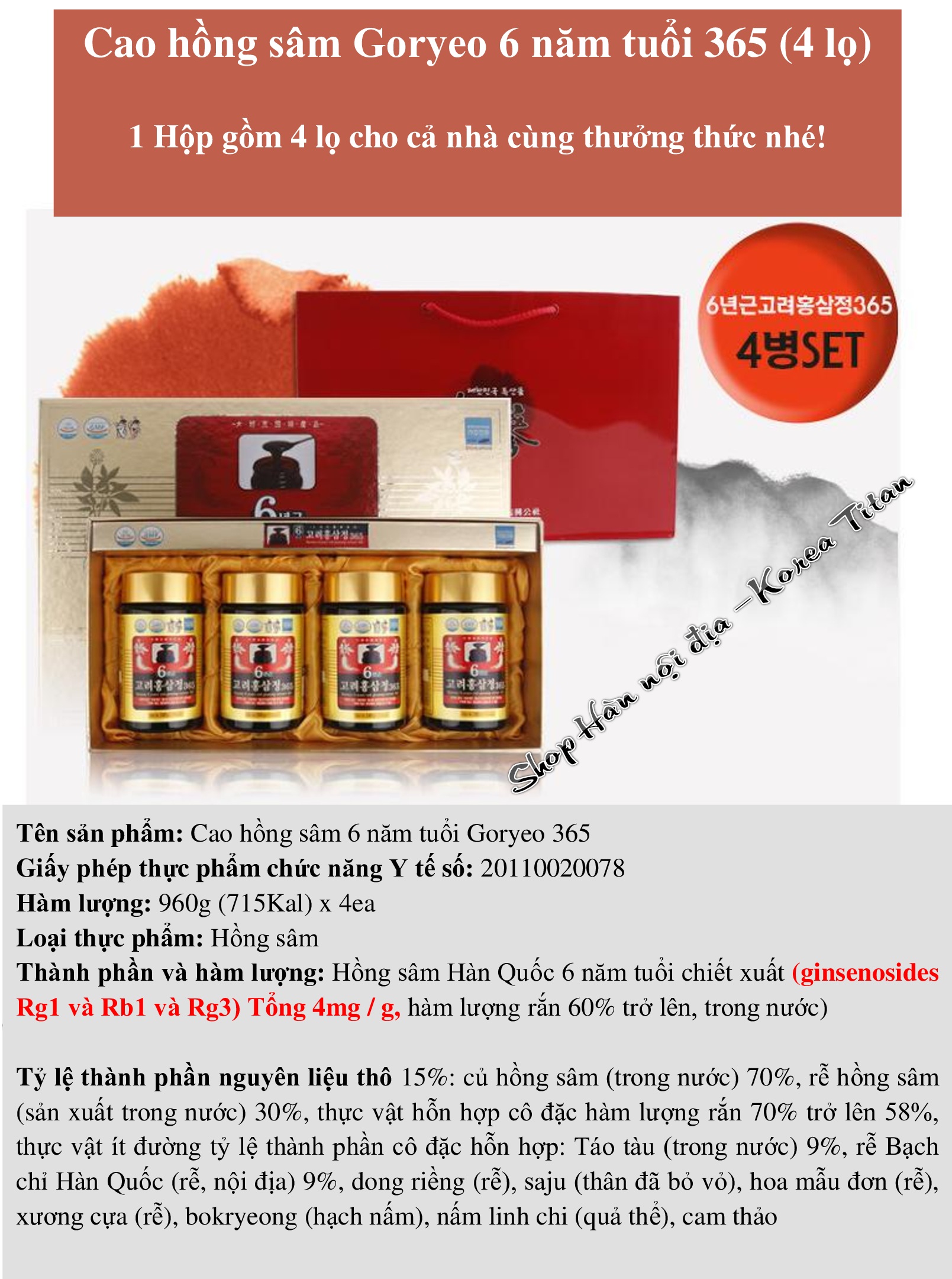 | Thương hiệu | Korean 6 years red ginseng extract 365 (cao hồng sâm 6 năm tuổi 365). |