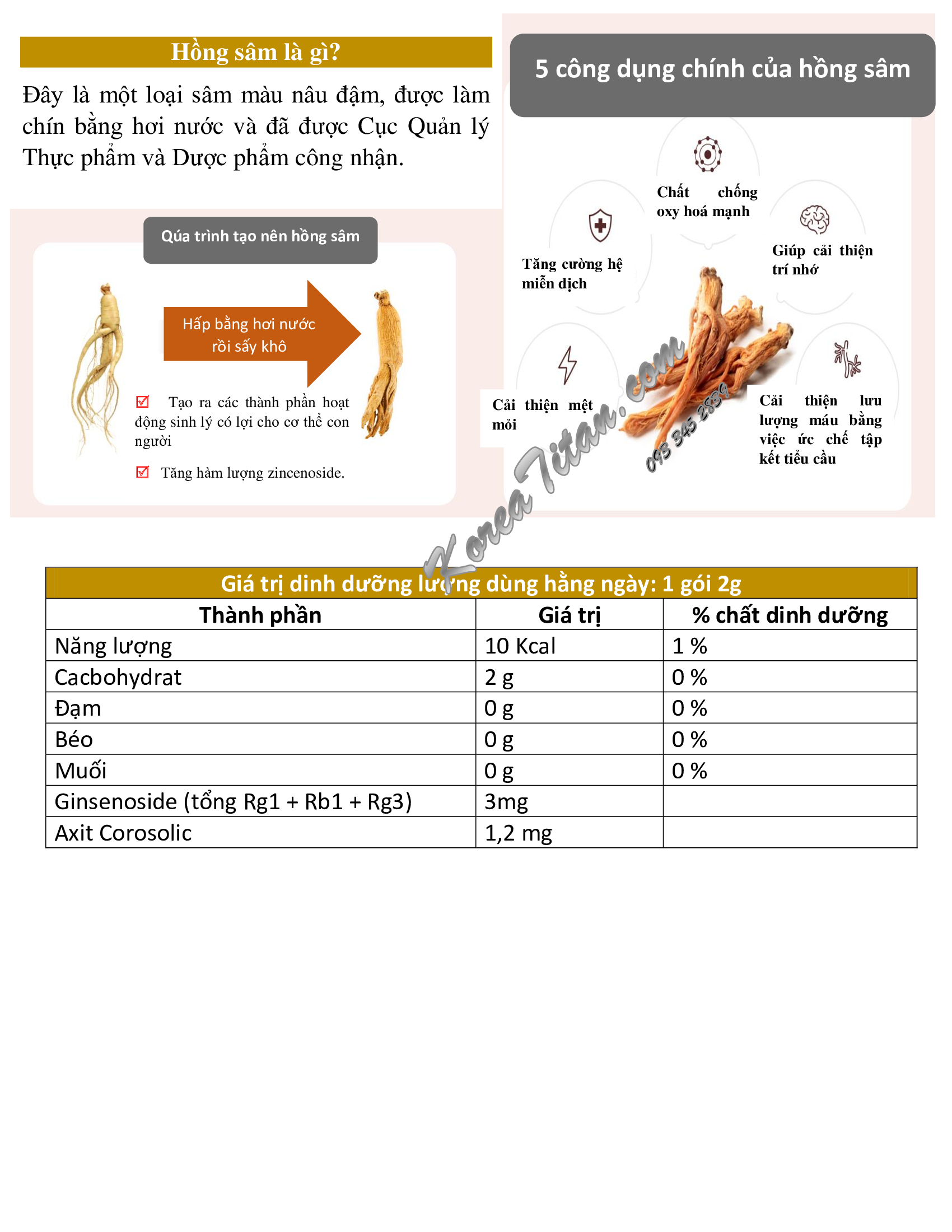 Cách dùng: Dùng trực tiếp gói sản phẩm cùng với nuớc lọc. Sản phẩm tan trong miệng của bạn, không dính trong miệng và hòa tan tuyệt vời. Hồng sâm có vị hơi mát, vị thanh thanh!