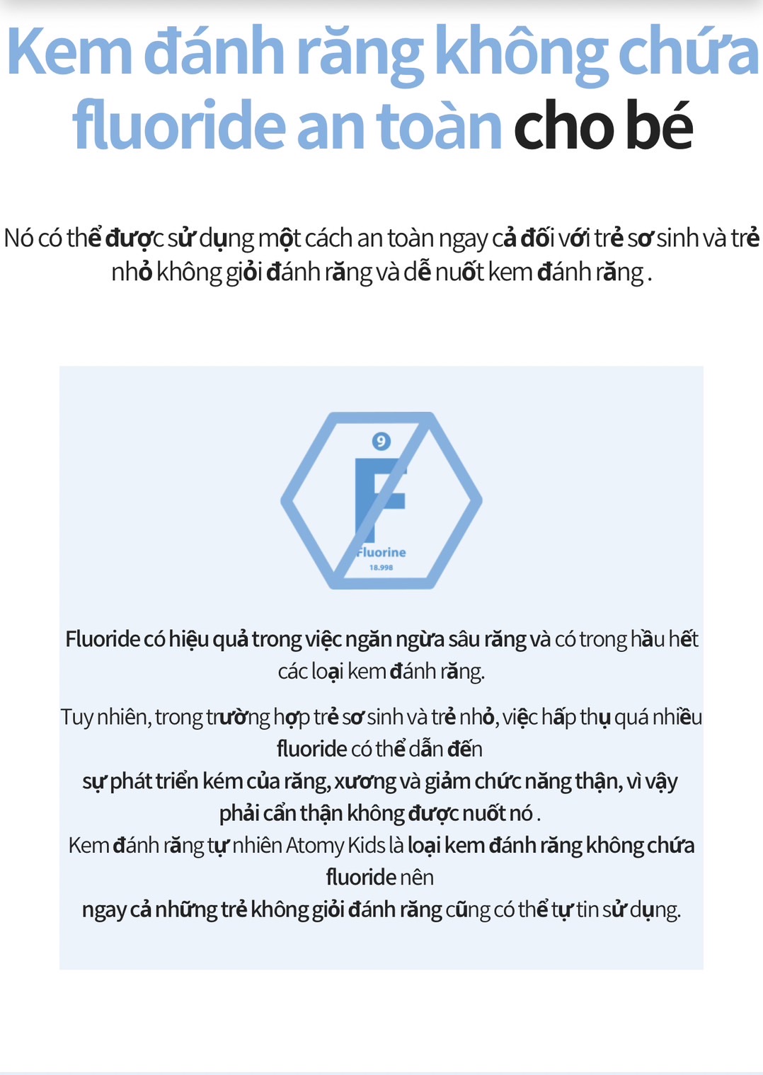 🔉 Trẻ dưới 6 tuổi ba mẹ nhắc nhỡ bé súc bằng nước sạch thật kỹ sau khi đánh răng, không được nuốt sản phẩm.
