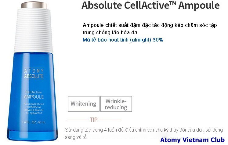 - Tinh chất dưỡng da chuyên sâu có trong Ampoule này còn nhiều hơn tinh chất của Essence và Serum nhiều lần. Đây chính là sự khác biệt của bộ sản phẩm ATOMY ABSOLUTE CELL ACTIVE SKINCARE SET so với các bộ dưỡng da khác của Atomy.