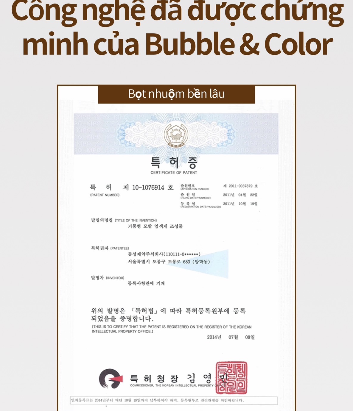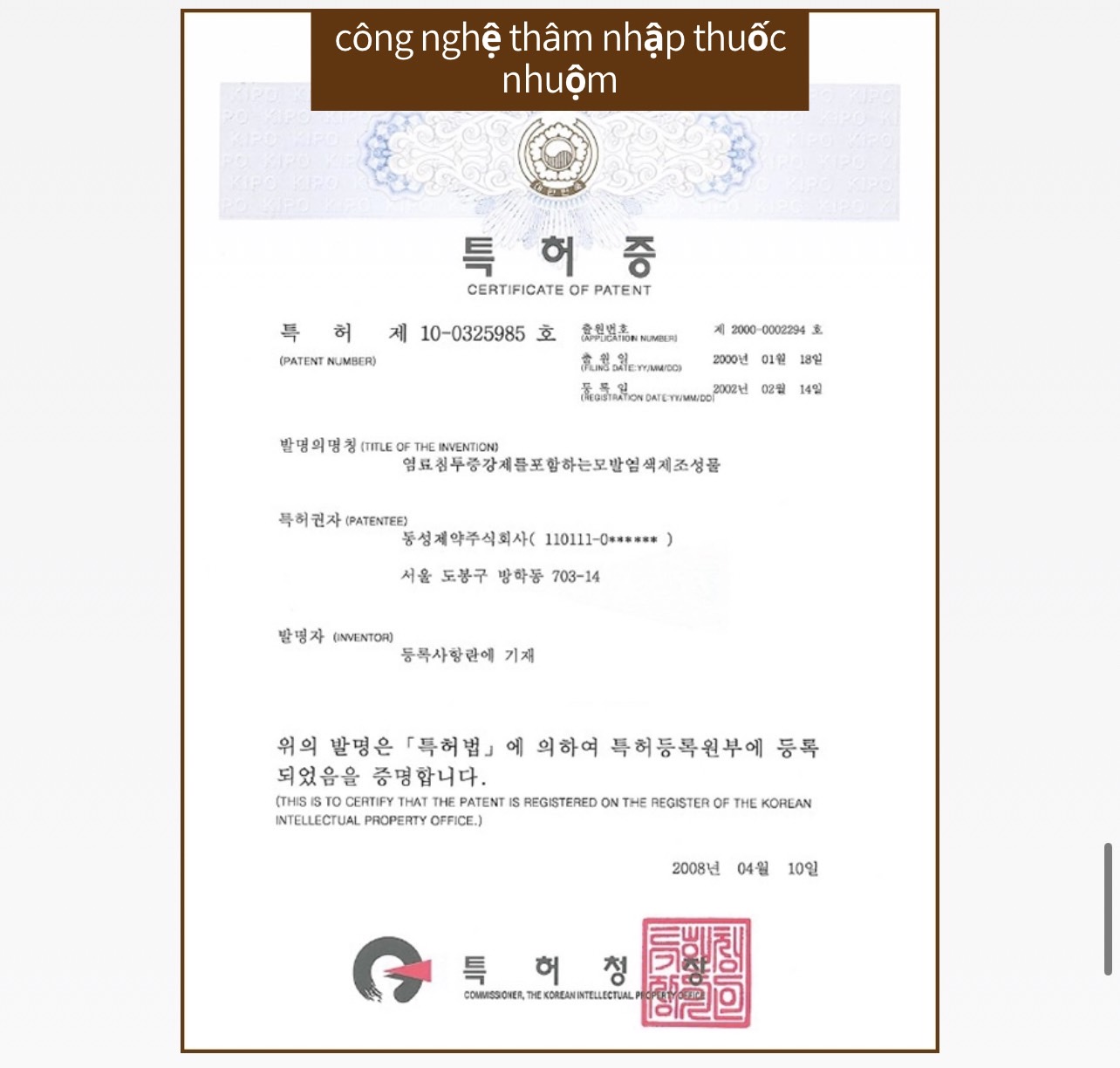 - Các cải tiến này của Atomy đã được cấp bằng sáng chế: Giữ màu lâu( bằng sáng chế số 10769)/ chăm sóc tóc hư tổn( Bằng sáng chế số 458007)/ Kỹ thuật thẩm thấu màu nhuộm( Bằng sáng chế số 325985)/ ngăn chặn tia tử ngoại( Bằng sáng chế số 665342)