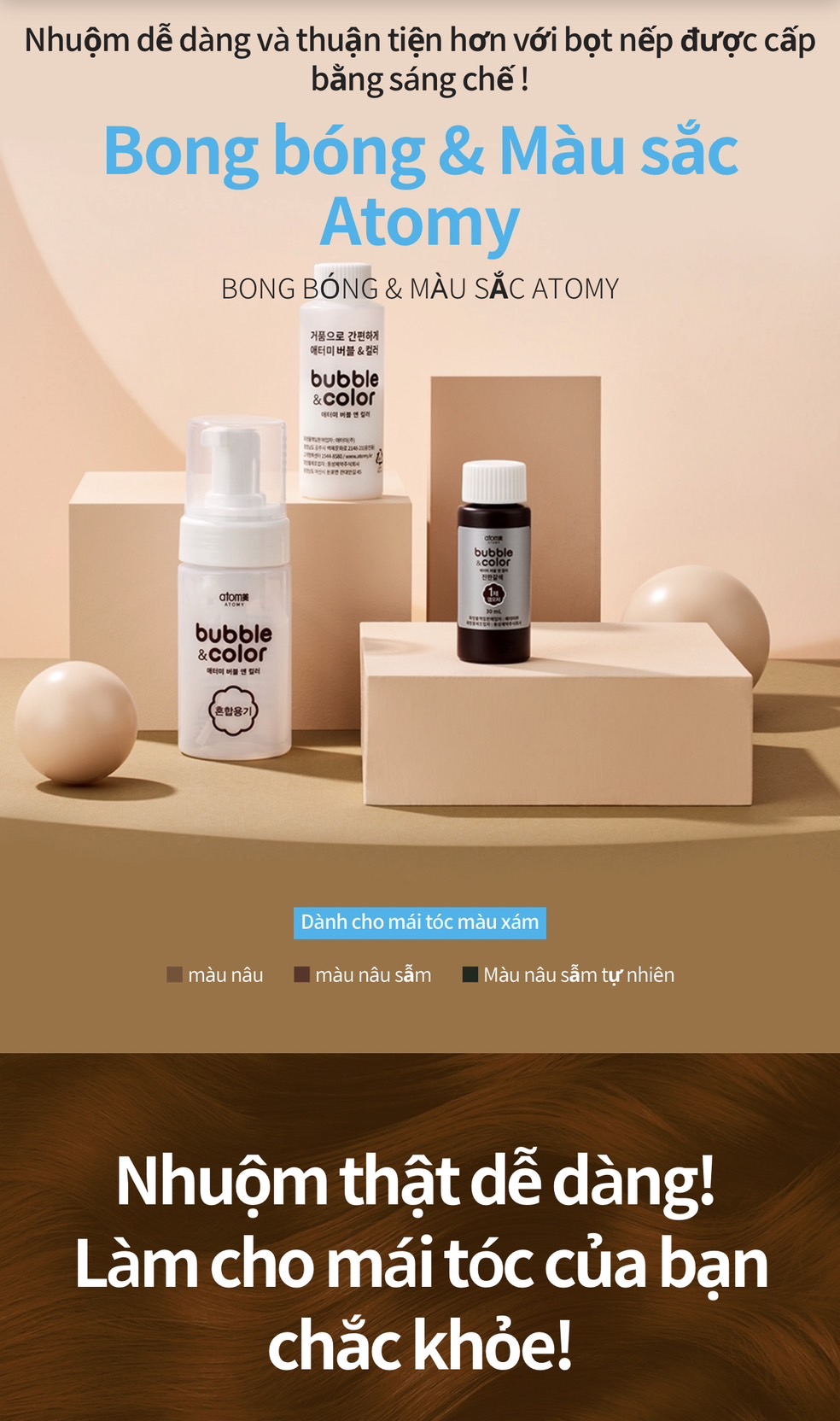 - Với xu hướng ưa chuộng các các sản phẩm thiên nhiên, Atomy đã cho ra đời sản phẩm dầu gội nhuộm tóc bền màu, an toàn da đầu, không chứa các thành phần độc hại, không mùi hôi khó chịu. Giúp cải tiến quá trình nhuộm tóc, vốn nhiều phức tạp và khó mà tự nhuộm được.