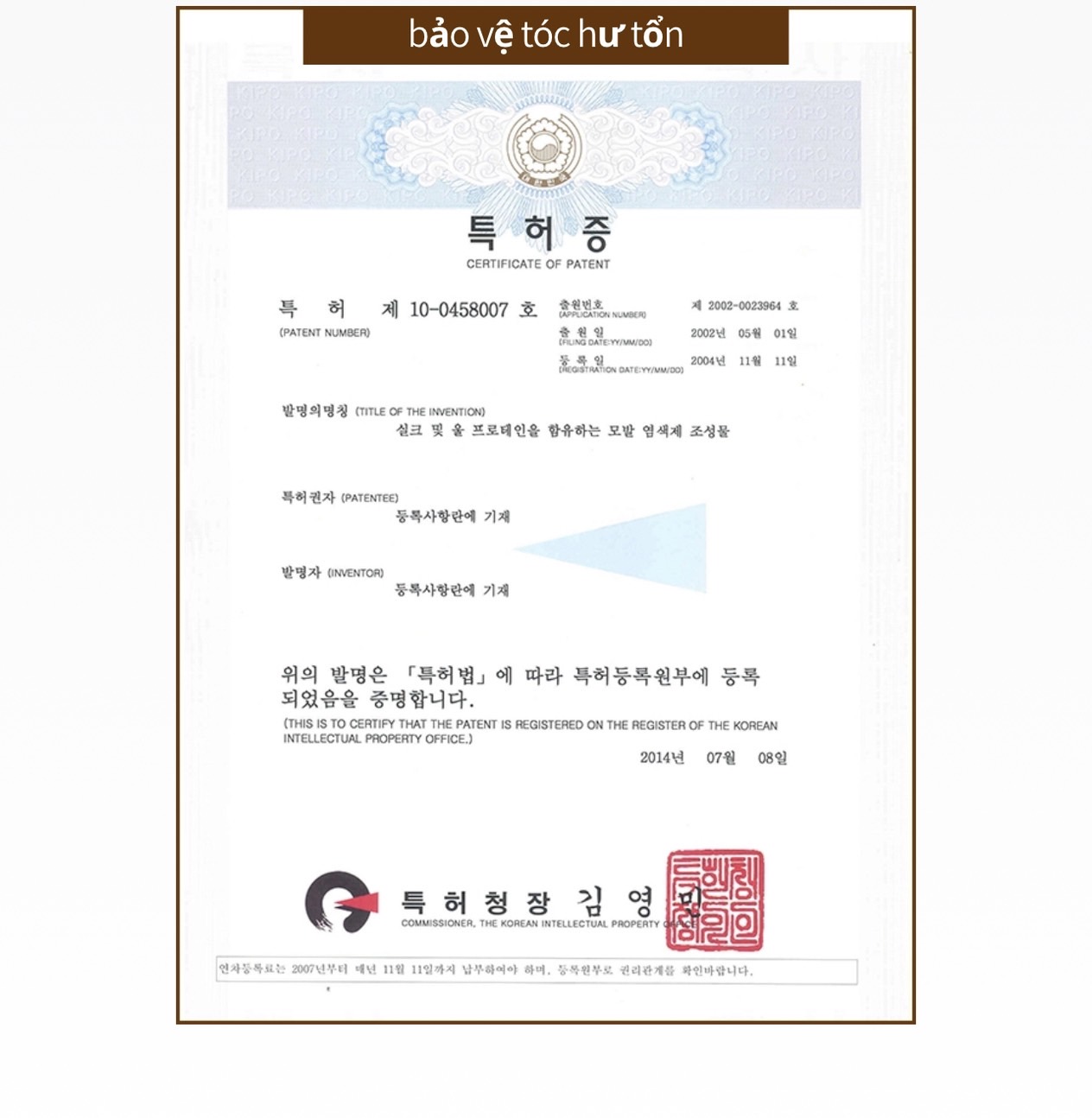 - Các cải tiến này của Atomy đã được cấp bằng sáng chế: Giữ màu lâu( bằng sáng chế số 10769)/ chăm sóc tóc hư tổn( Bằng sáng chế số 458007)/ Kỹ thuật thẩm thấu màu nhuộm( Bằng sáng chế số 325985)/ ngăn chặn tia tử ngoại( Bằng sáng chế số 665342)