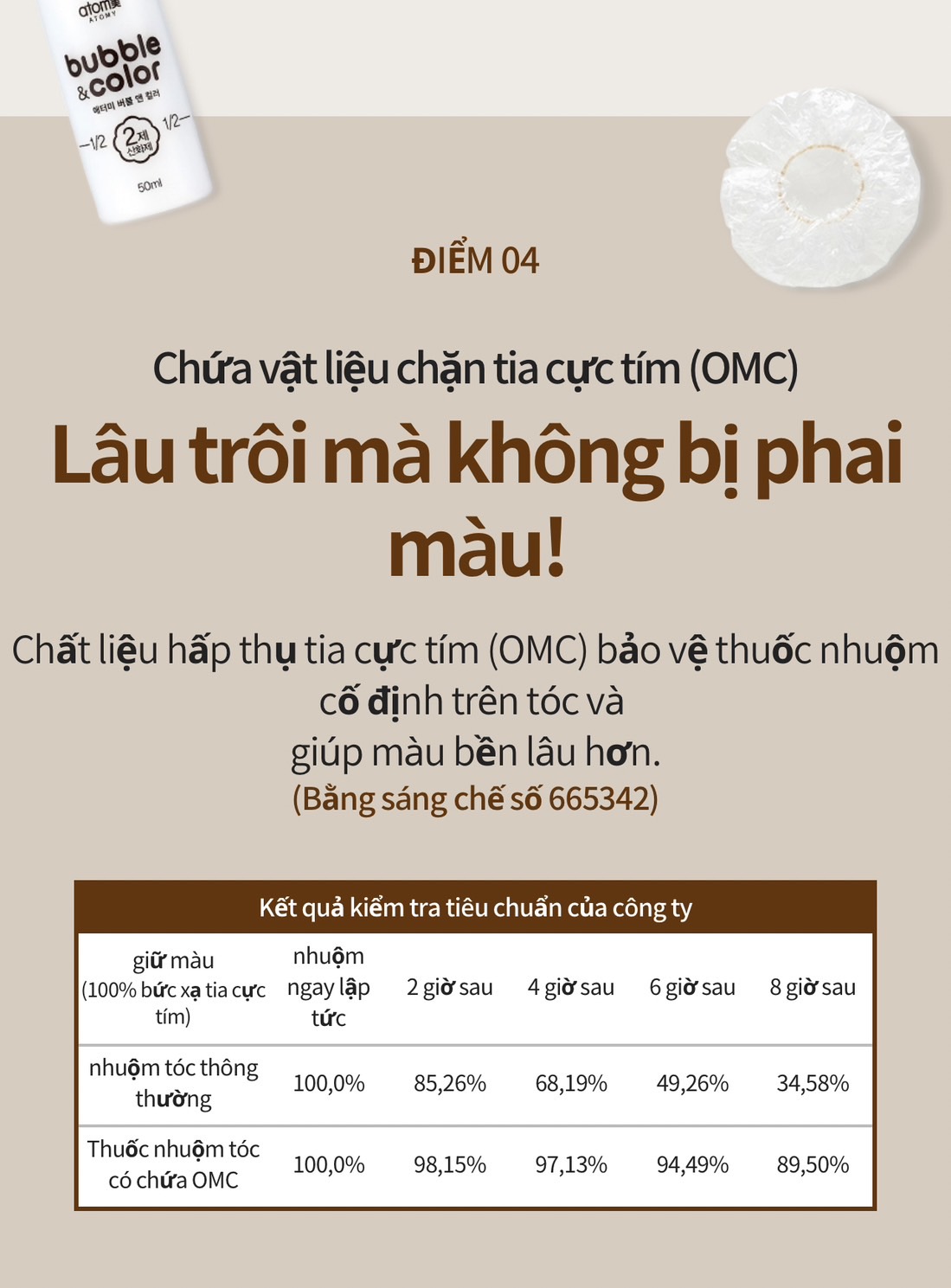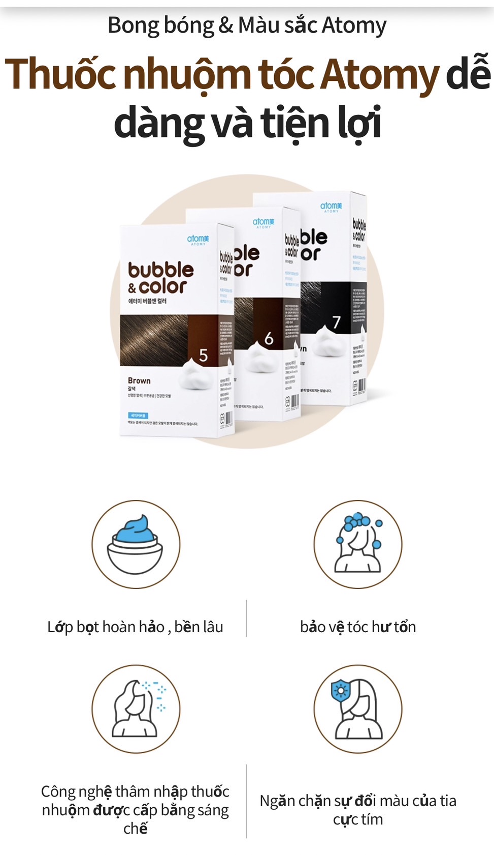 Dầu gội nhuộm tóc Atomy Bubble & Color giữ màu lâu, có thể phản chiếu tia tử ngoại của ánh nắng mặt trời gây hư tổn cho tóc.