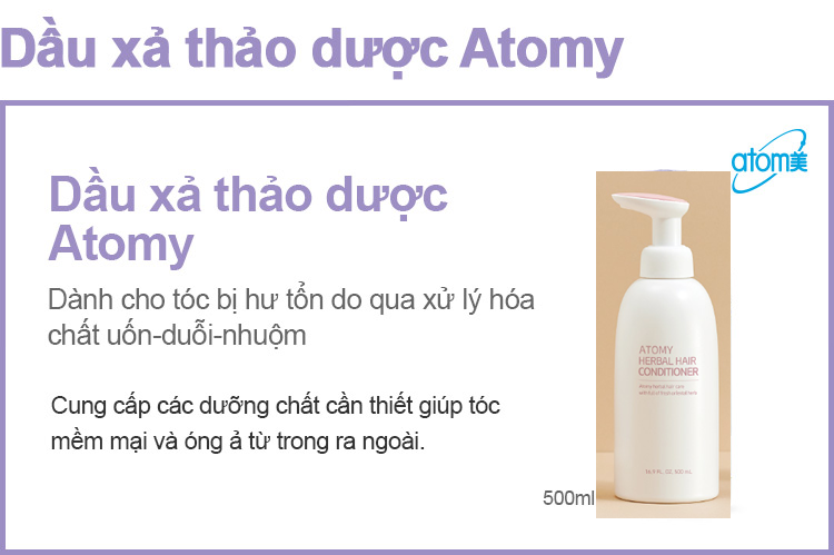 - Làm cho tóc cực kỳ bóng mượt bằng các dưỡng chất làm giàu và giữ ẩm từ bên trong. Dầu xả thảo dược Atomy còn có 1 hợp chất silicon đặc biệt phủ lên tóc làm tóc mượt mà và giảm xơ rối