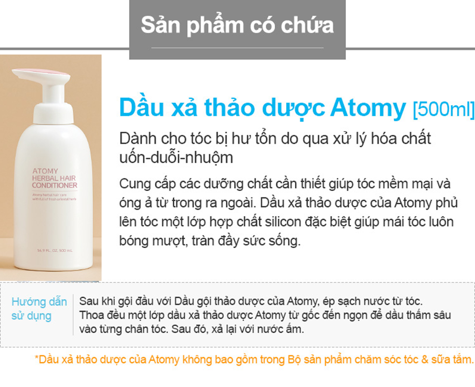 - Các thành phần thảo mộc gần giống như dầu gội Atomy chỉ thay đổi tỷ lệ các loại thảo mộc, đây là sản phẩm hoàn hảo khi kết hợp với dầu gội Atomy sẽ tăng hiệu quả chăm sóc tóc.
