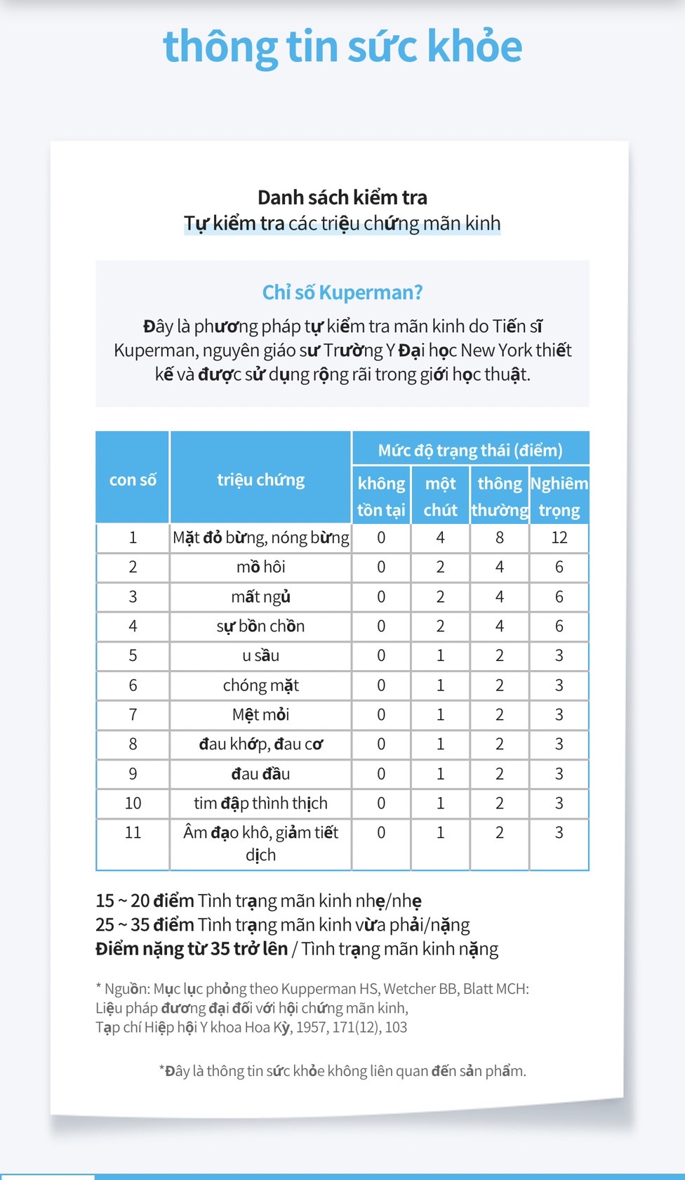 - Sản phẩm dành riêng cho phụ nữ trong độ tuổi 40~60 mãn kinh & tiền mãn kinh thường hay xuất hiện các triệu chứng như hay cảm thấy khó chịu , đau đầu, rối loạn nhịp tim ,các cơ khớp nhức mỏi , mất ngủ, chóng mặt , hay mệt mỏi đổ mồ hôi... biểu hiện của tuổi già.