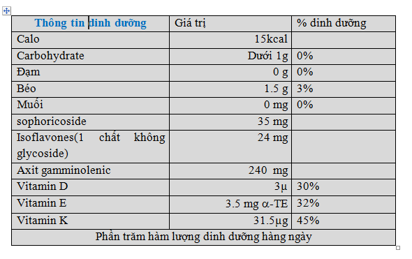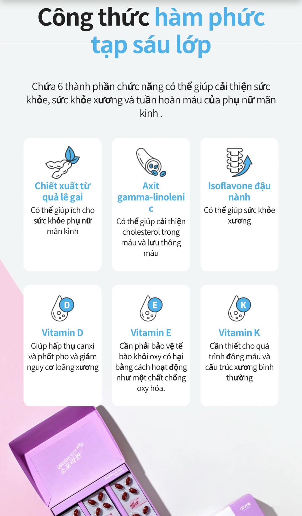 - Giúp cải thiện lưu thông máu, làm giảm lượng cholesterol trong máu, chắc xương, axit gamma-linolenic với 6 loại khoáng chất, chất isoflavones có trong đậu nành, được chiết xuất từ hoa hòe với công thức đặc biệt có khả năng tổng hợp 6 loại dành cho sức khỏe nữ giới thời kỳ mãn kinh