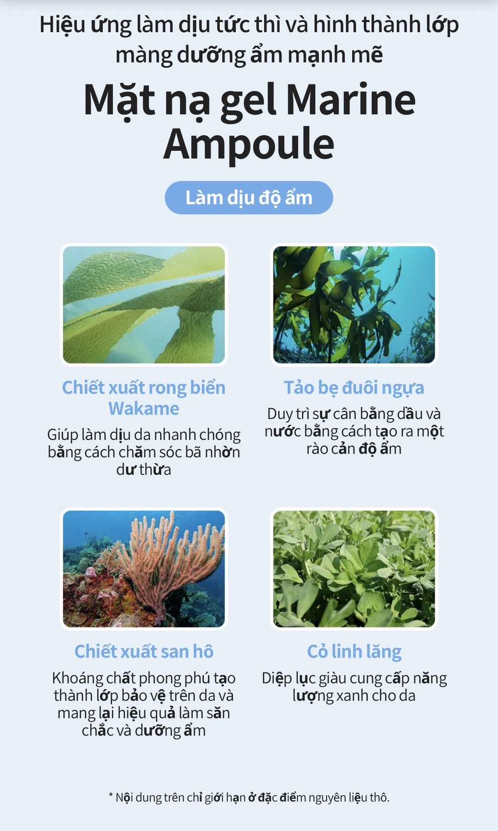 🍀 Thành phần bổ sung: , Carrageenan, cỏ linh lăng, Chiết xuất Ecklonia, Chiết xuất Geliridium Cartillaginia, Chiết xuất Dogtail, Chiết xuất hoa violet, Chiết xuất tảo bẹ, Chiết xuất trà xanh, Chiết xuất lá bạch quả, Chiết xuất mầm lúa mì, Chiết xuất lá cây hoa trà, Chiết xuất mầm bông cải xanh, Chiết xuất lá tên lửa...