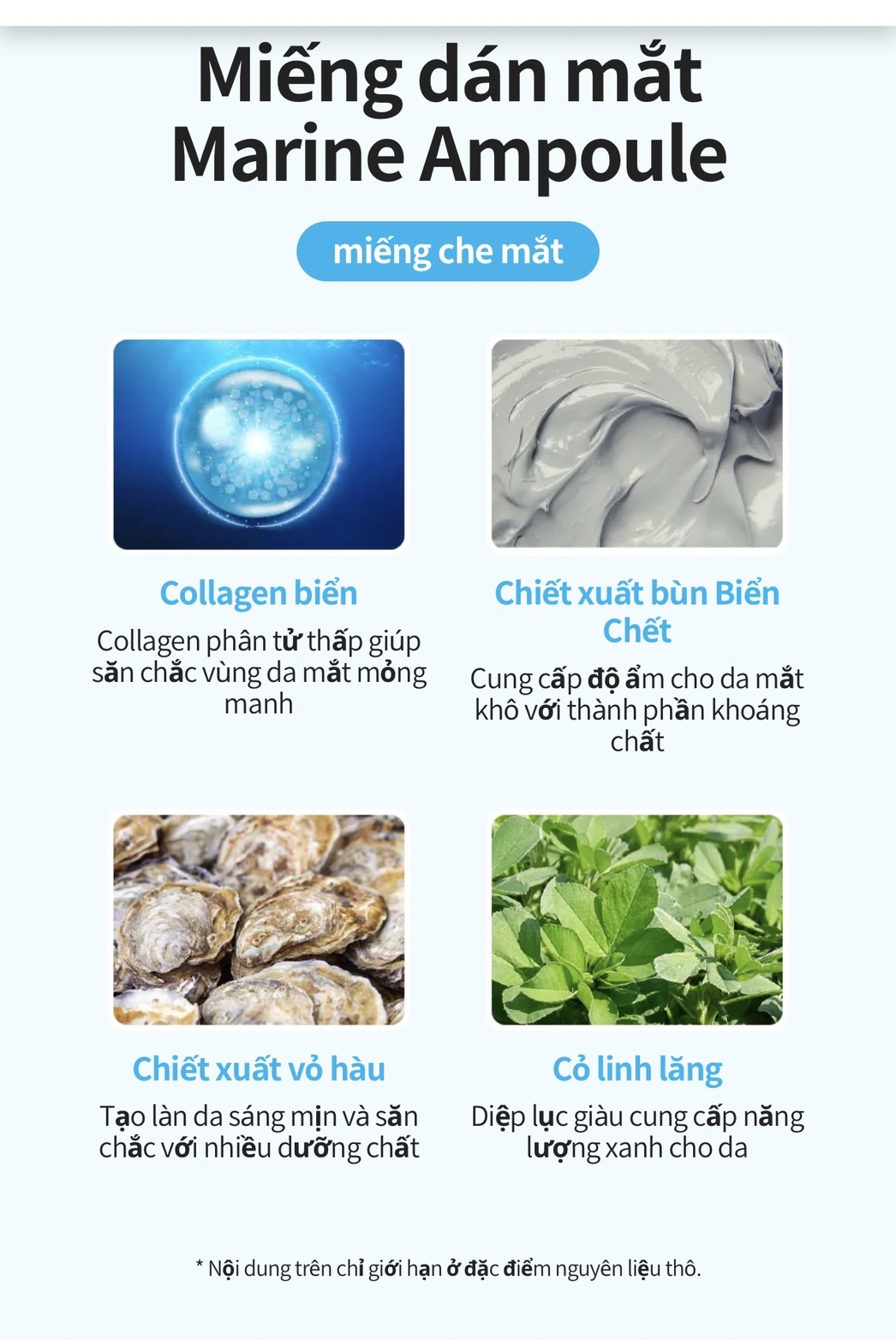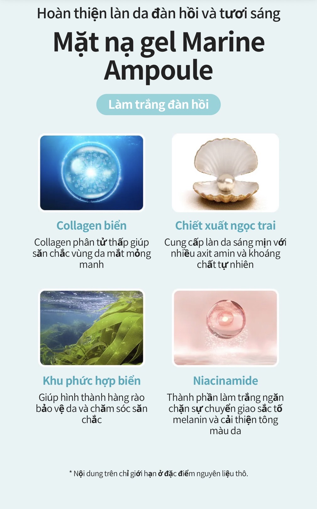 🍀 Thành phần chính: Chiết xuất rong biển, chiết xuất vỏ Hàu, Peptide Collagen, bùn khoáng, Niacinamide