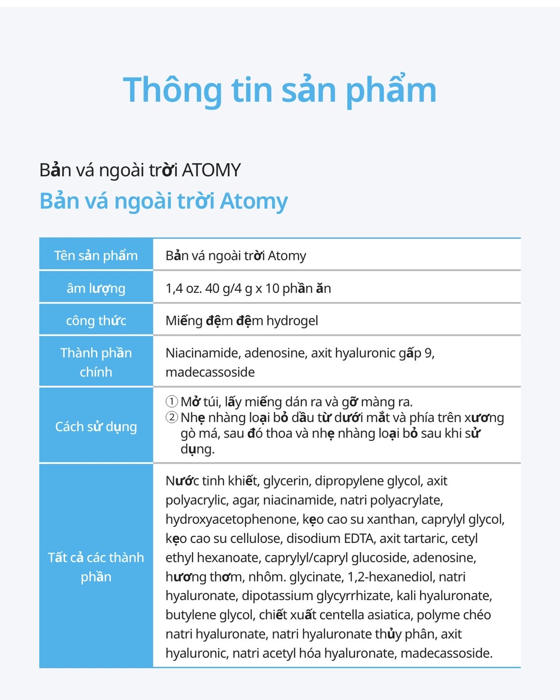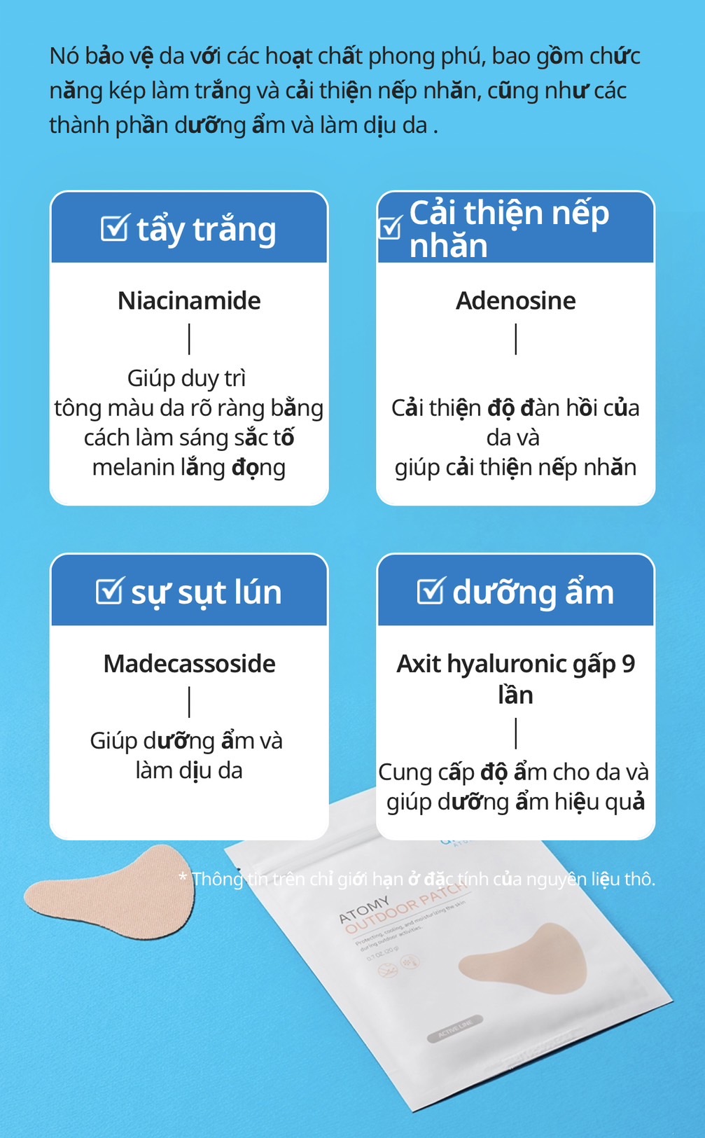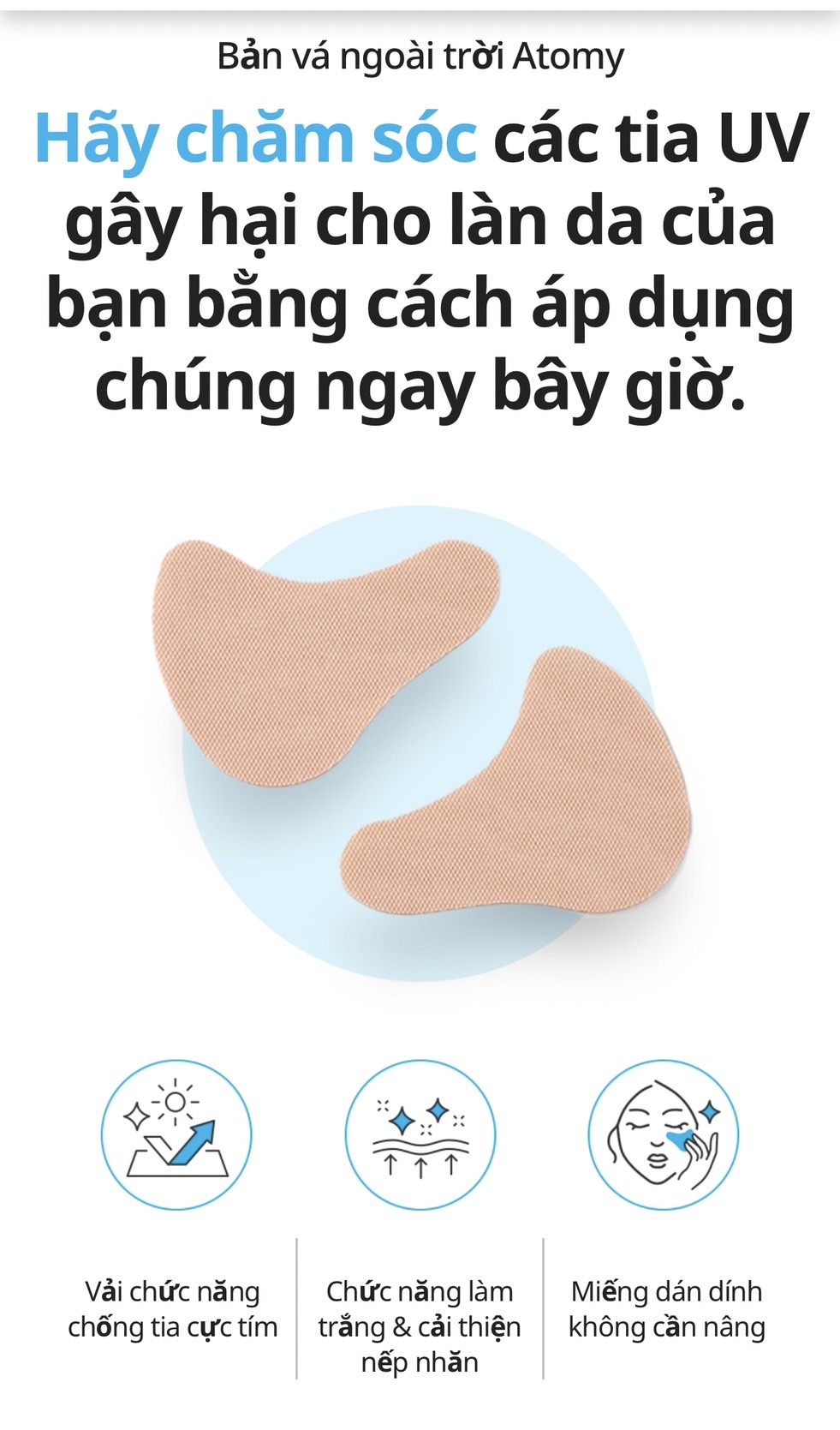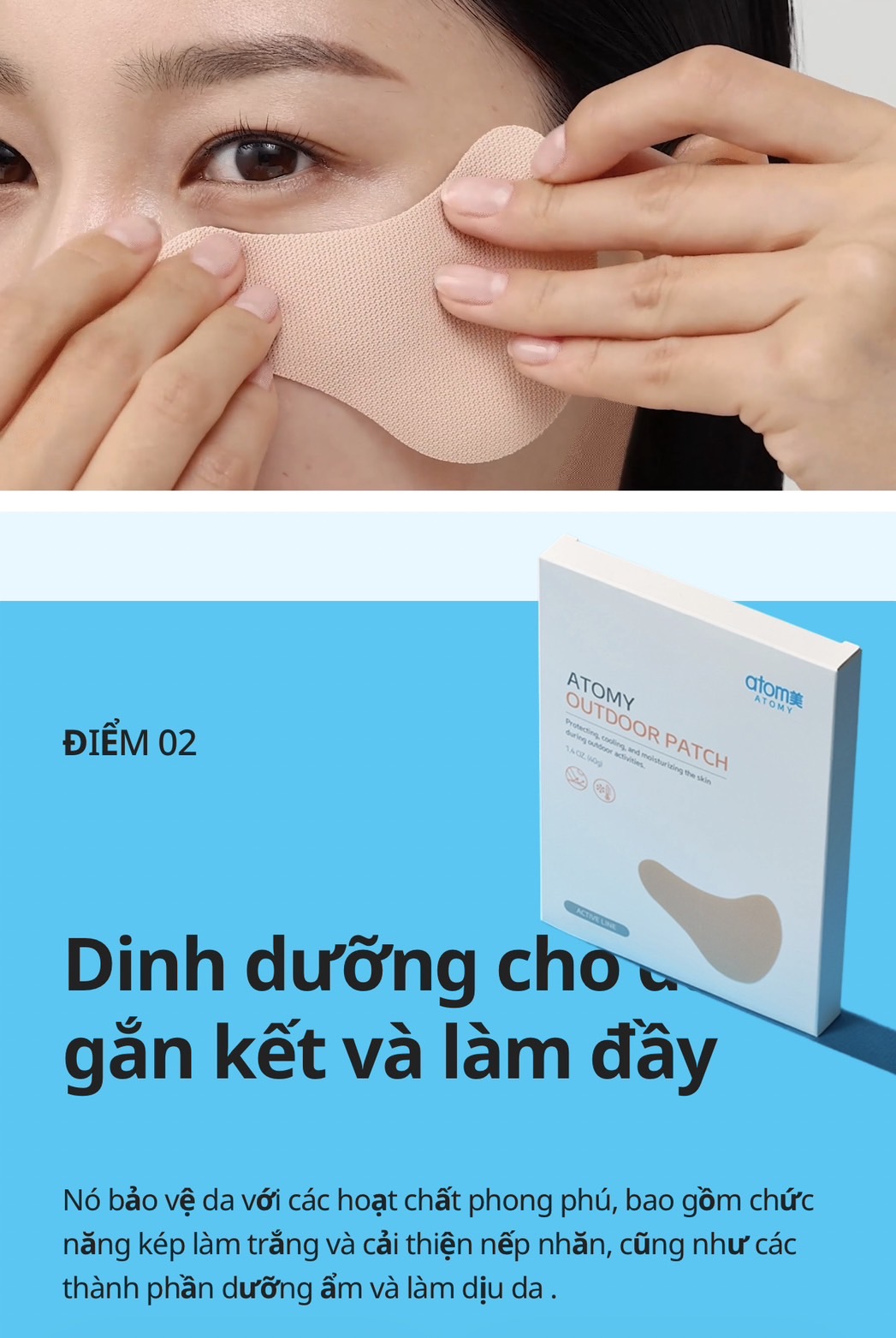 🌞 Atomy Outdoor Patch giúp ngăn ngừa tia UV, dưỡng trắng da, giảm nếp nhăn, bảo vệ da dưới tác động trực tiếp của ánh nắng mặt trời.