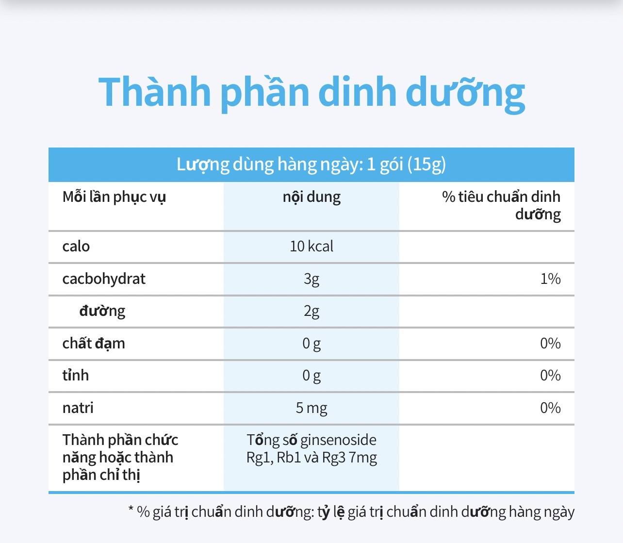 - Thành phần chính: Chiết xuất 100% hồng sâm 4 năm tuổi tỷ lệ 70% củ hồng sâm và 30% rể hồng sâm