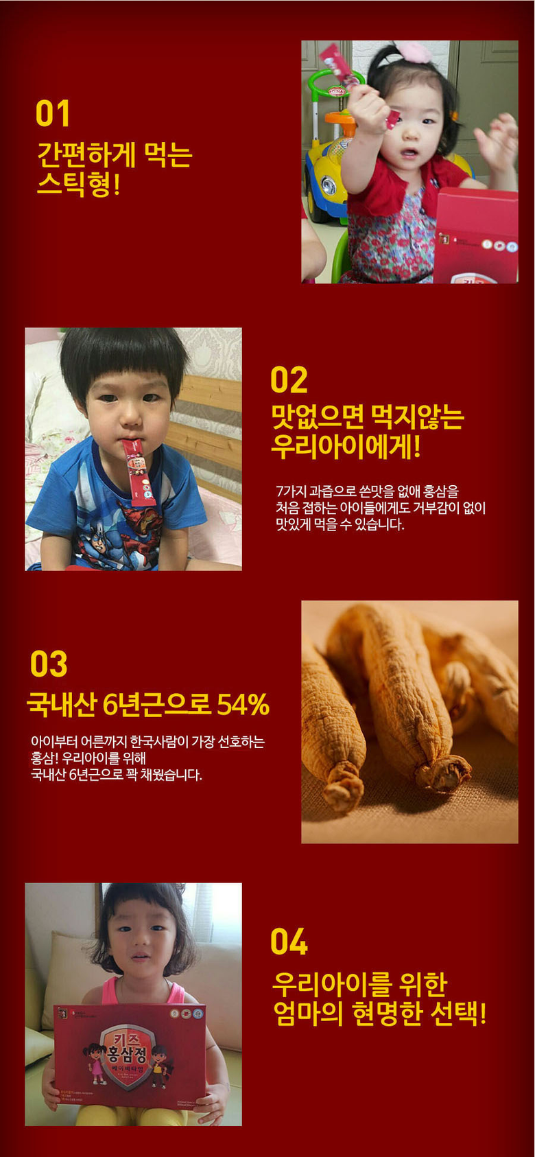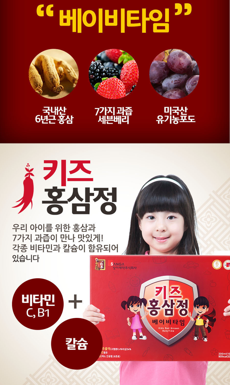 - Từ xa xưa, người Hàn Quốc đã nổi tiếng với việc dùng nhân sâm để duy trì sức khỏe và phòng chống bệnh tật. Hồng sâm cho trẻ em Kid Red Ginseng Baby Time của Hàn Quốc với thành phần chính là hồng sâm ( chiếm đến 54%) kế thừa toàn bộ tinh hoa của hồng sâm Hàn Quốc trong việc chăm sóc sức khỏe.