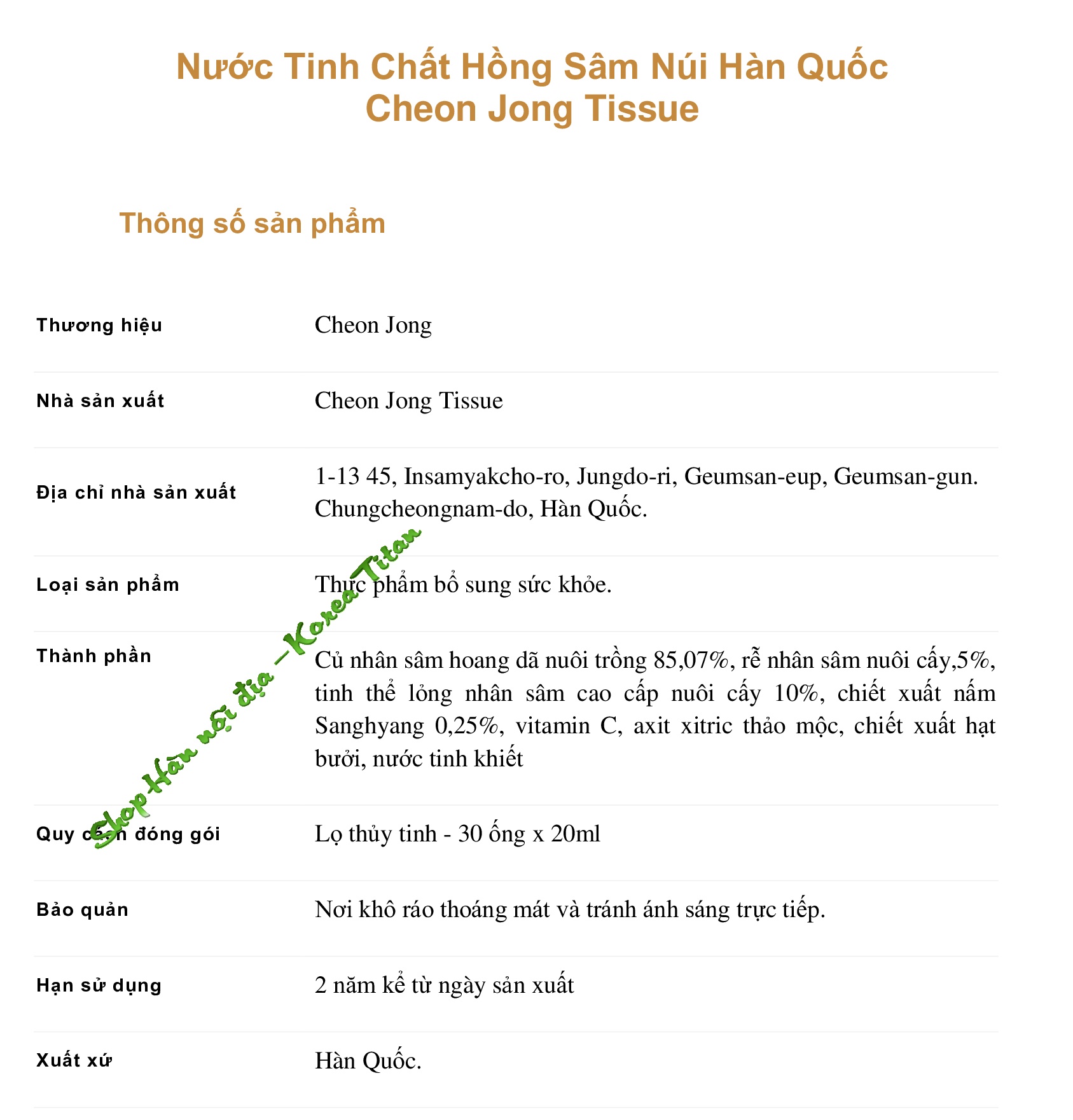 Nước Tinh Chất Hồng Sâm Núi Hàn Quốc Cheon Jong Tissue Cultured Korean Mountain Gingseng