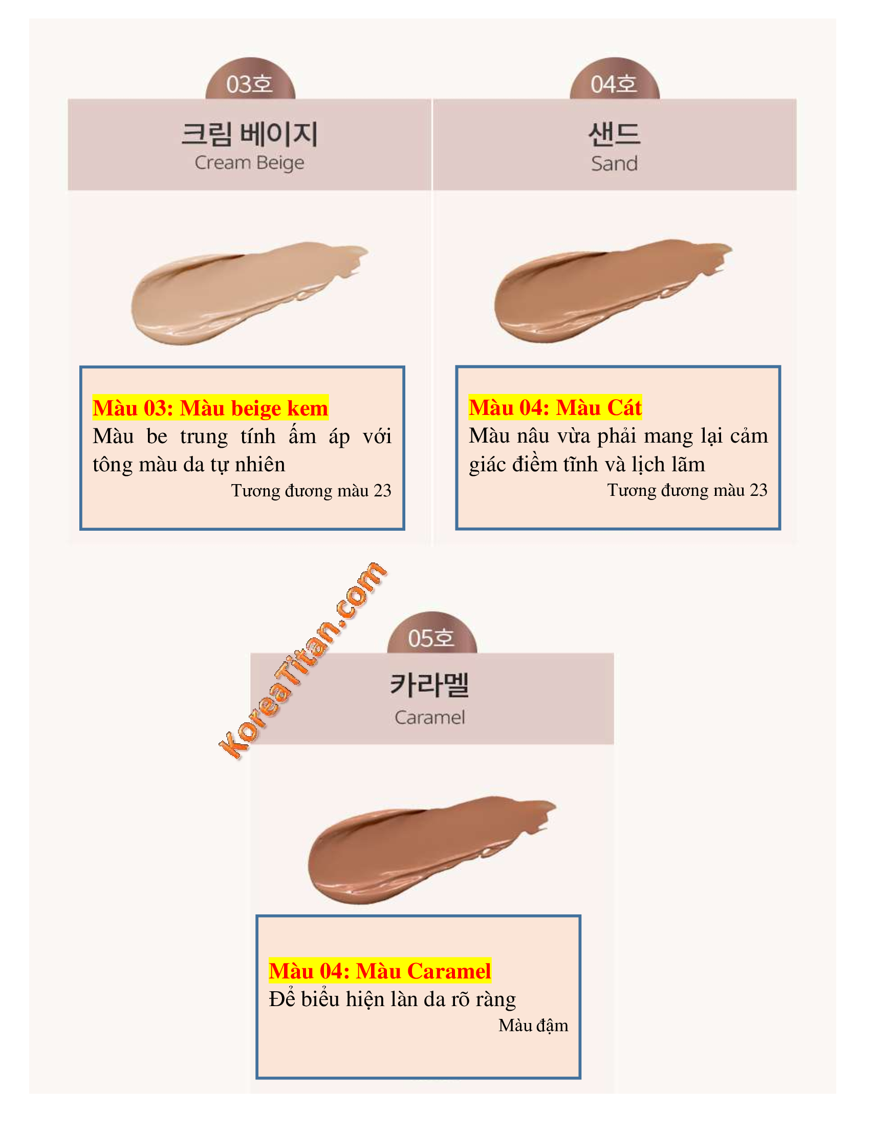👌 Số 03 크림베이지 Màu be kem/ Cream Beige: Màu be trung tính với tông da tự nhiên và ấm áp tông màu da tự nhiên "Khuyến nghị số 23"