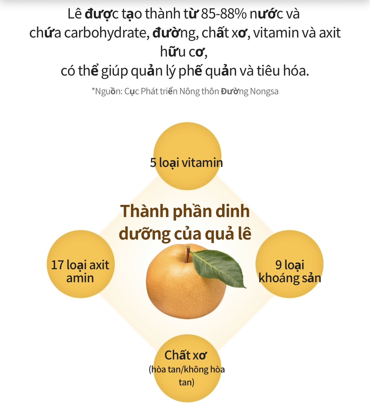 𝟭. 𝗡𝘂̛𝗼̛́𝗰 𝗟𝗲̂ 𝗛𝗮̀𝗻 𝗤𝘂𝗼̂́𝗰-𝗞𝗼𝗿𝗲𝗮𝗻 𝗣𝗲𝗮𝗿 : Chứa một số lượng lớn chất chống oxy hóa flavonoid và polyphenol, Giàu chất xơ, kali, đường tự nhiên và axit aspartic.
