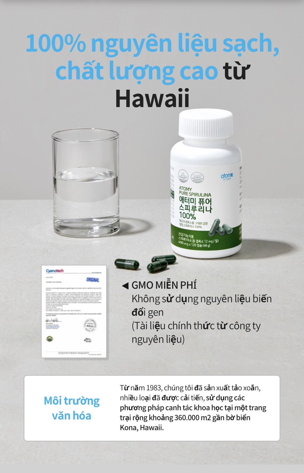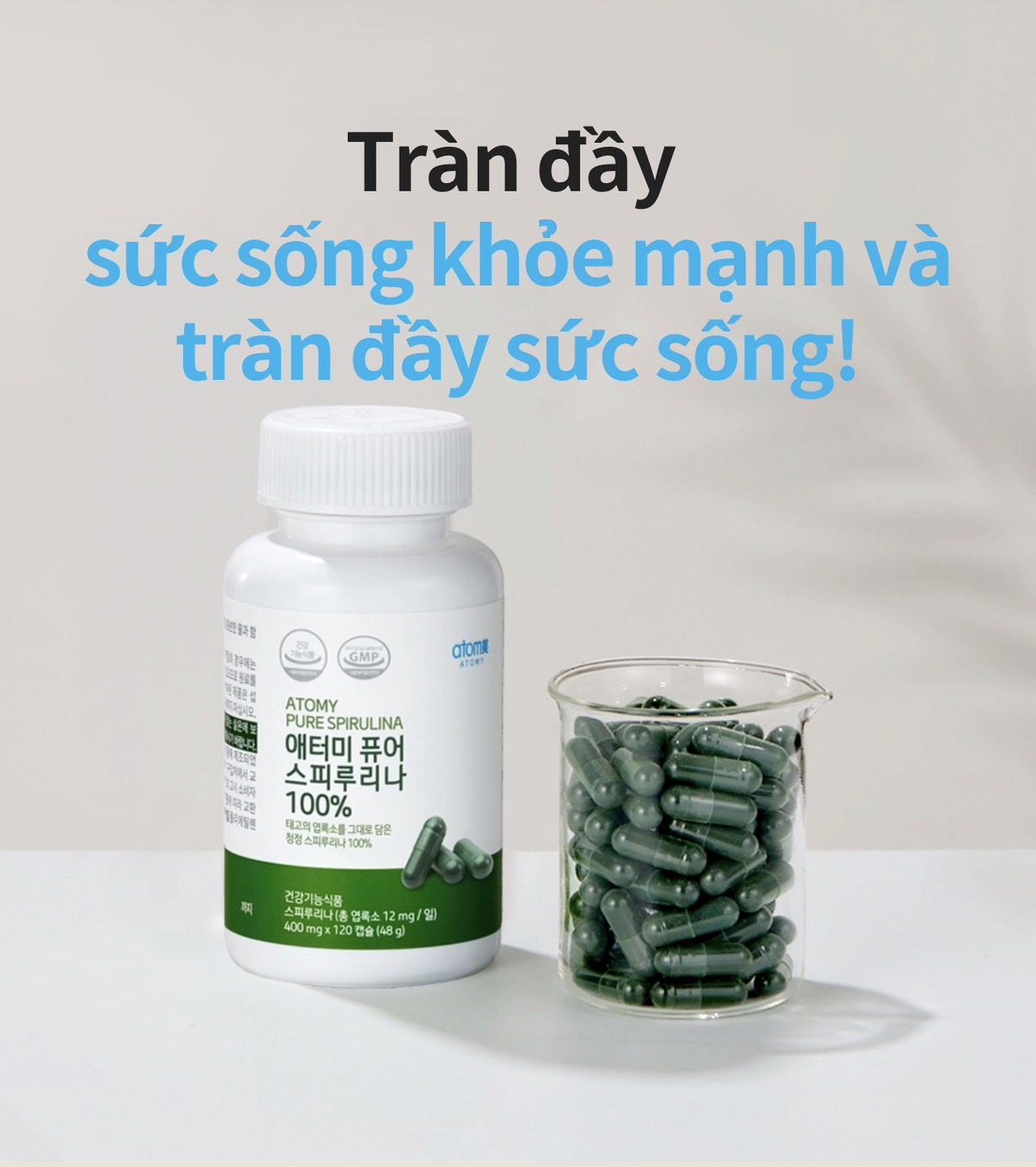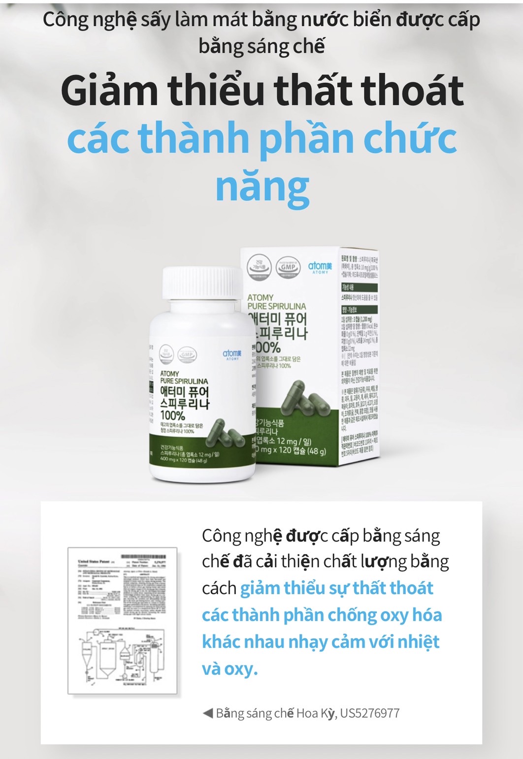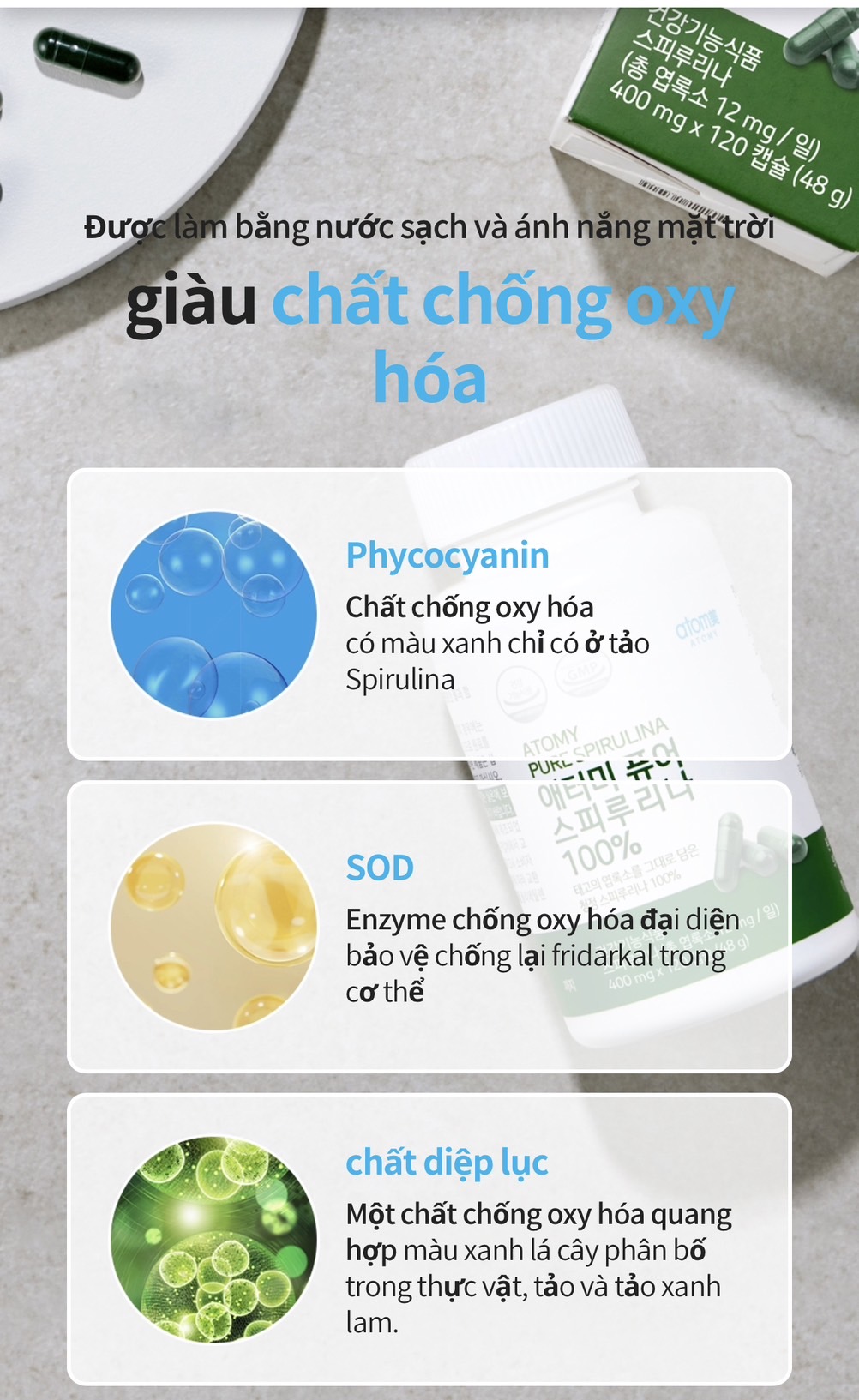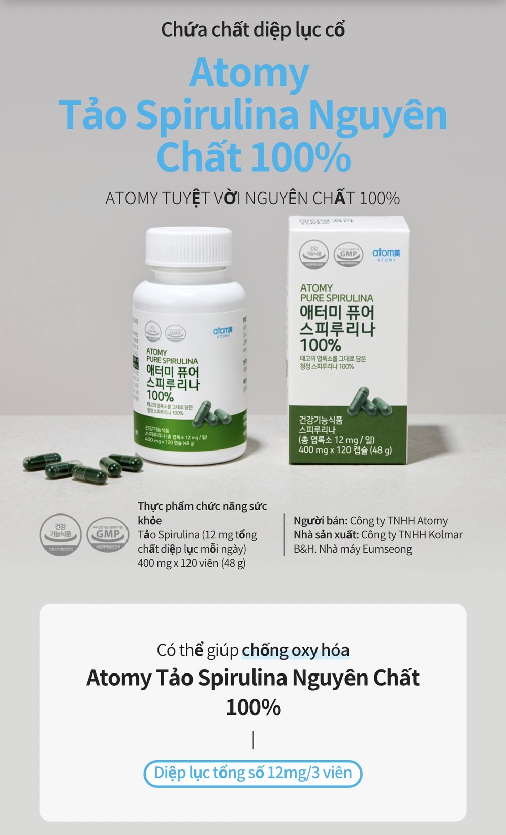 - Atomy Pure Spirulia là dạng thực phẩm chức năng với 100% tảo xoắn Spirulina chứa các chất dinh dưỡng thiết yếu cho cơ thể: Protein, Lipid, Đường, Chất xơ, Khoáng chất, Vitamin và chất chống oxy hóa.