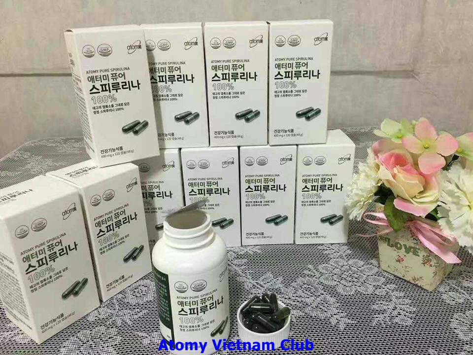 - Atomy Pure Spirulia là dạng thực phẩm chức năng với 100% tảo xoắn Spirulina chứa các chất dinh dưỡng thiết yếu cho cơ thể: Protein, Lipid, Đường, Chất xơ, Khoáng chất, Vitamin và chất chống oxy hóa.