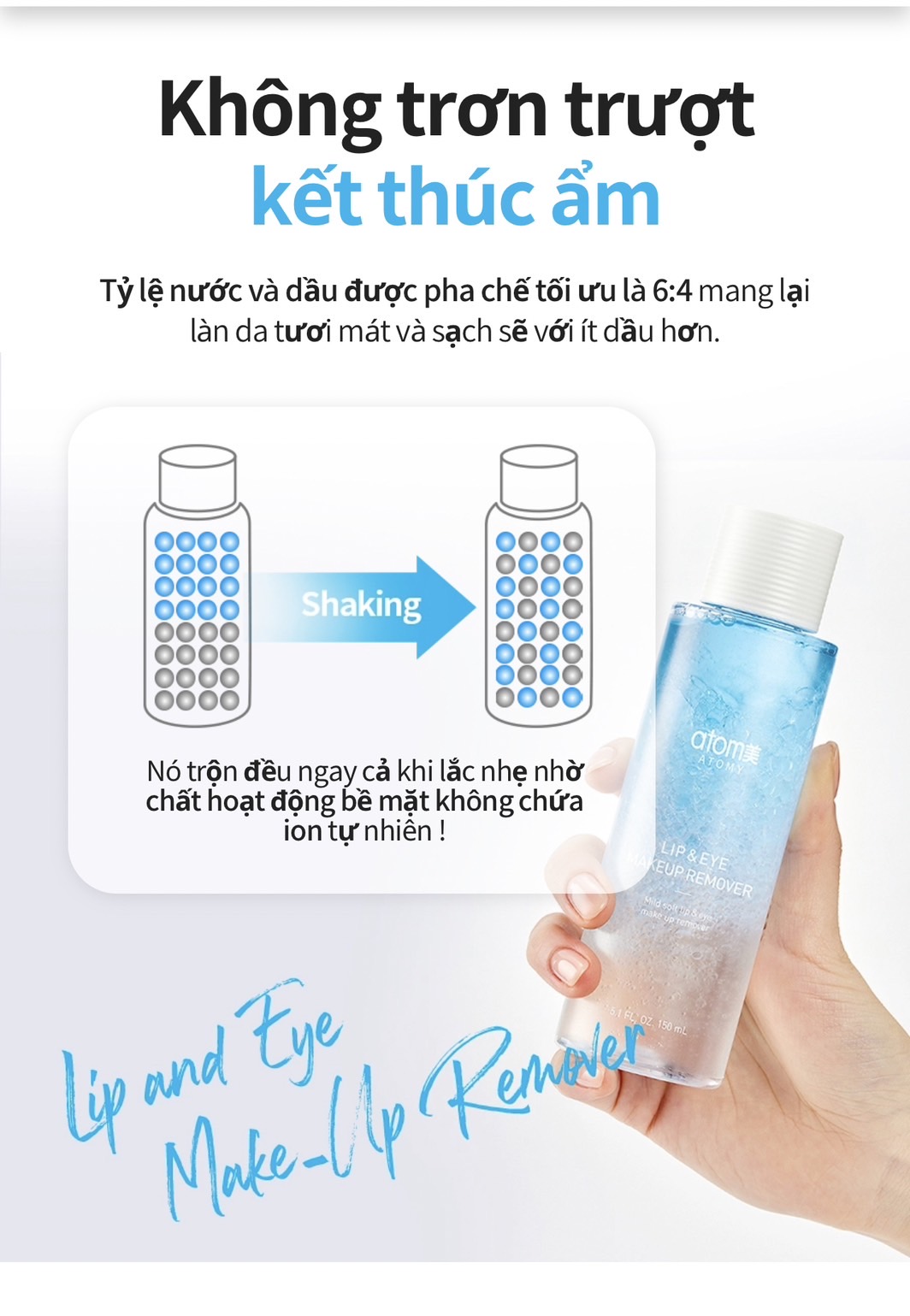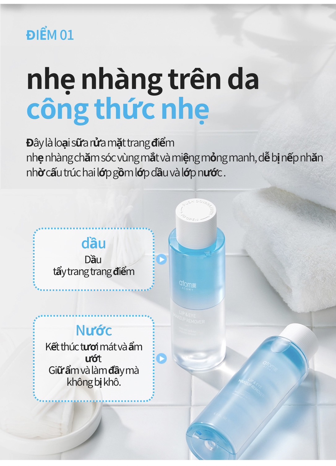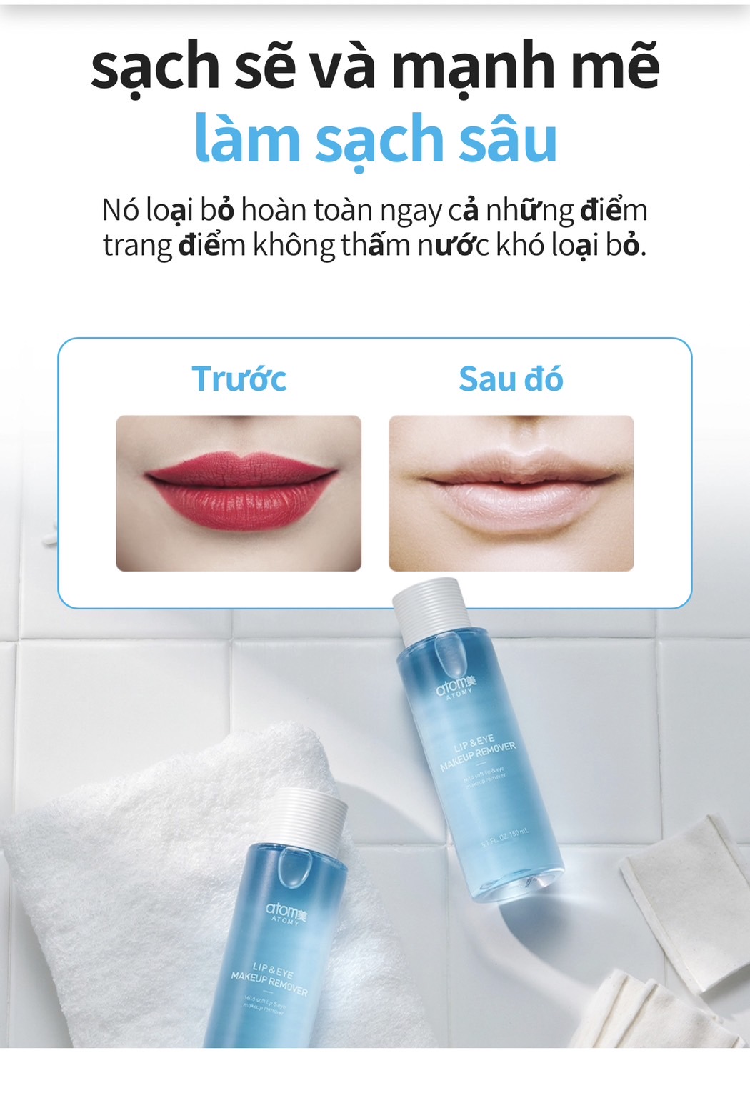 👉Tẩy trang Atomy dành cho Mắt & Môi với cấu trúc 2 lớp Dầu và Nước Atomy Lip & Eye Remover là sản phẩm tích hợp 2 trong 1, vừa có thể tẩy trang cho mắt, vừa có thể tẩy trang cho môi một cách nhẹ nhàng, ngay cả khi đó là một lớp trang điểm đậm.