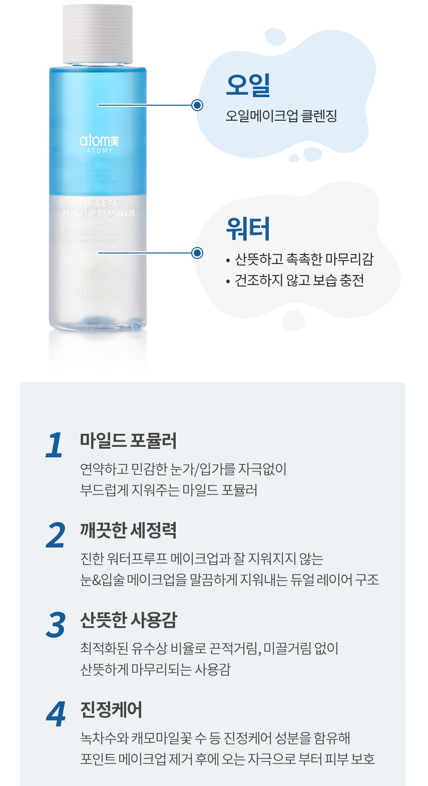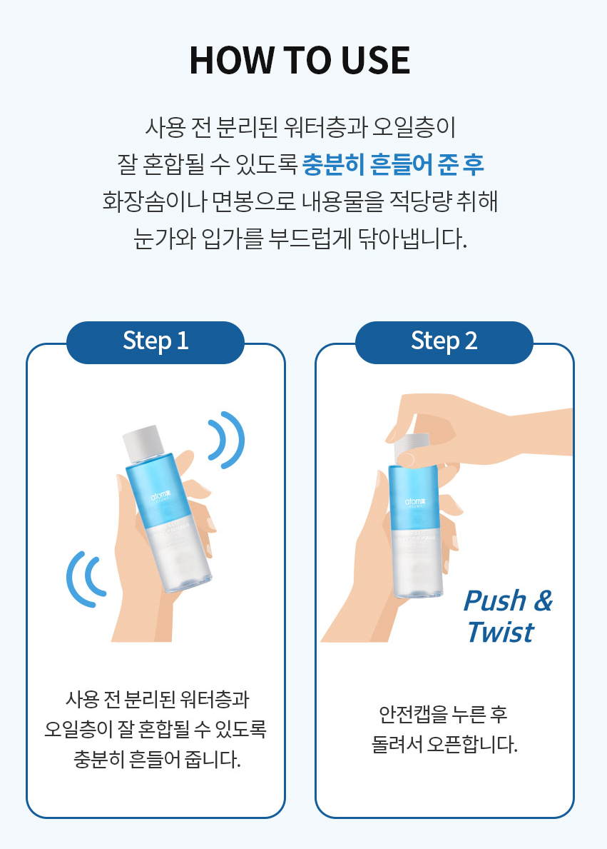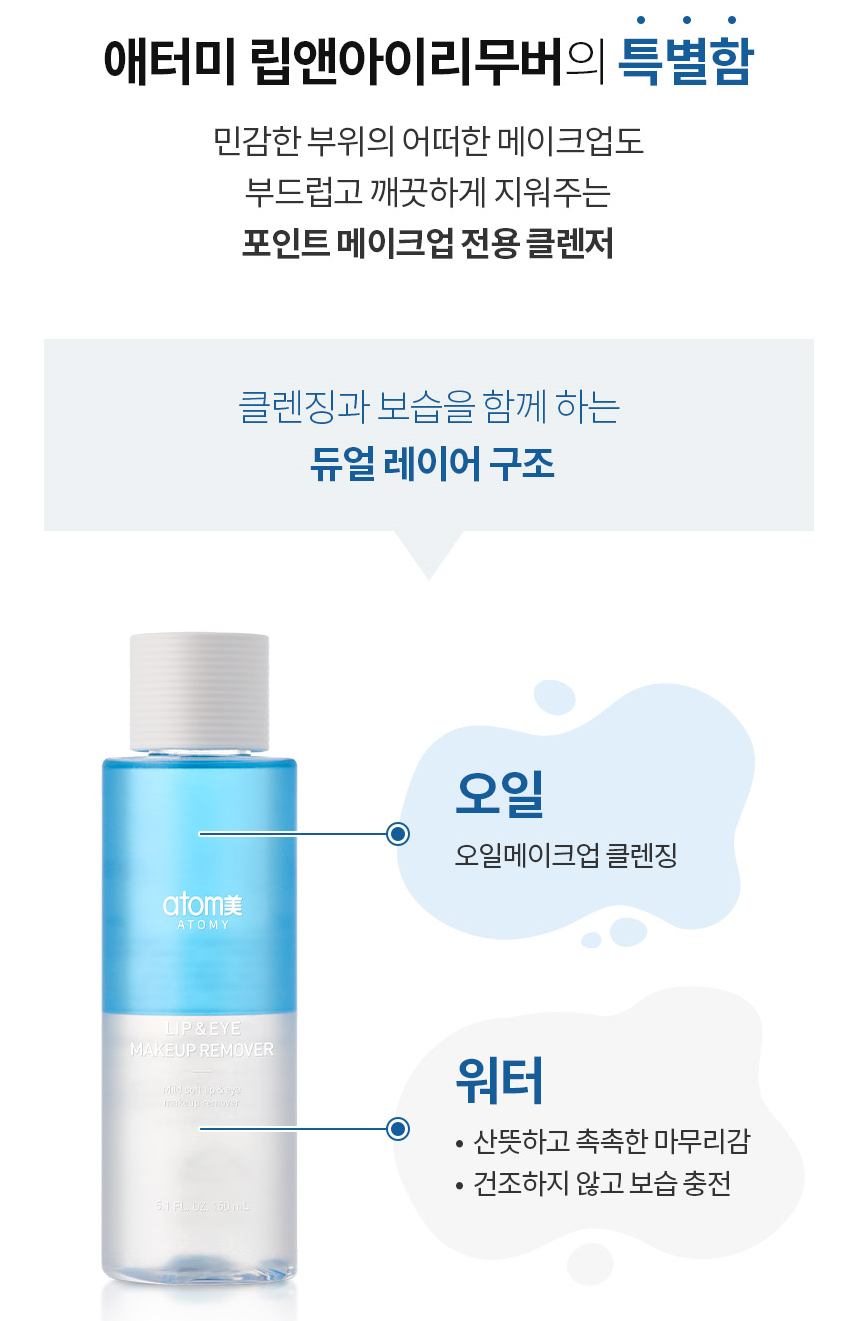👉Tẩy trang Atomy dành cho Mắt & Môi với cấu trúc 2 lớp Dầu và Nước Atomy Lip & Eye Remover là sản phẩm tích hợp 2 trong 1, vừa có thể tẩy trang cho mắt, vừa có thể tẩy trang cho môi một cách nhẹ nhàng, ngay cả khi đó là một lớp trang điểm đậm.