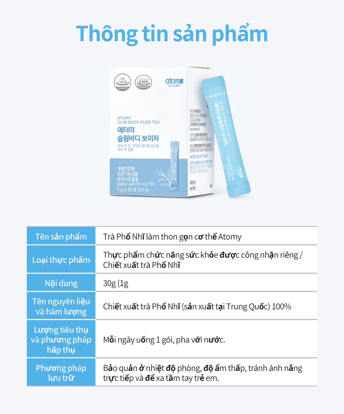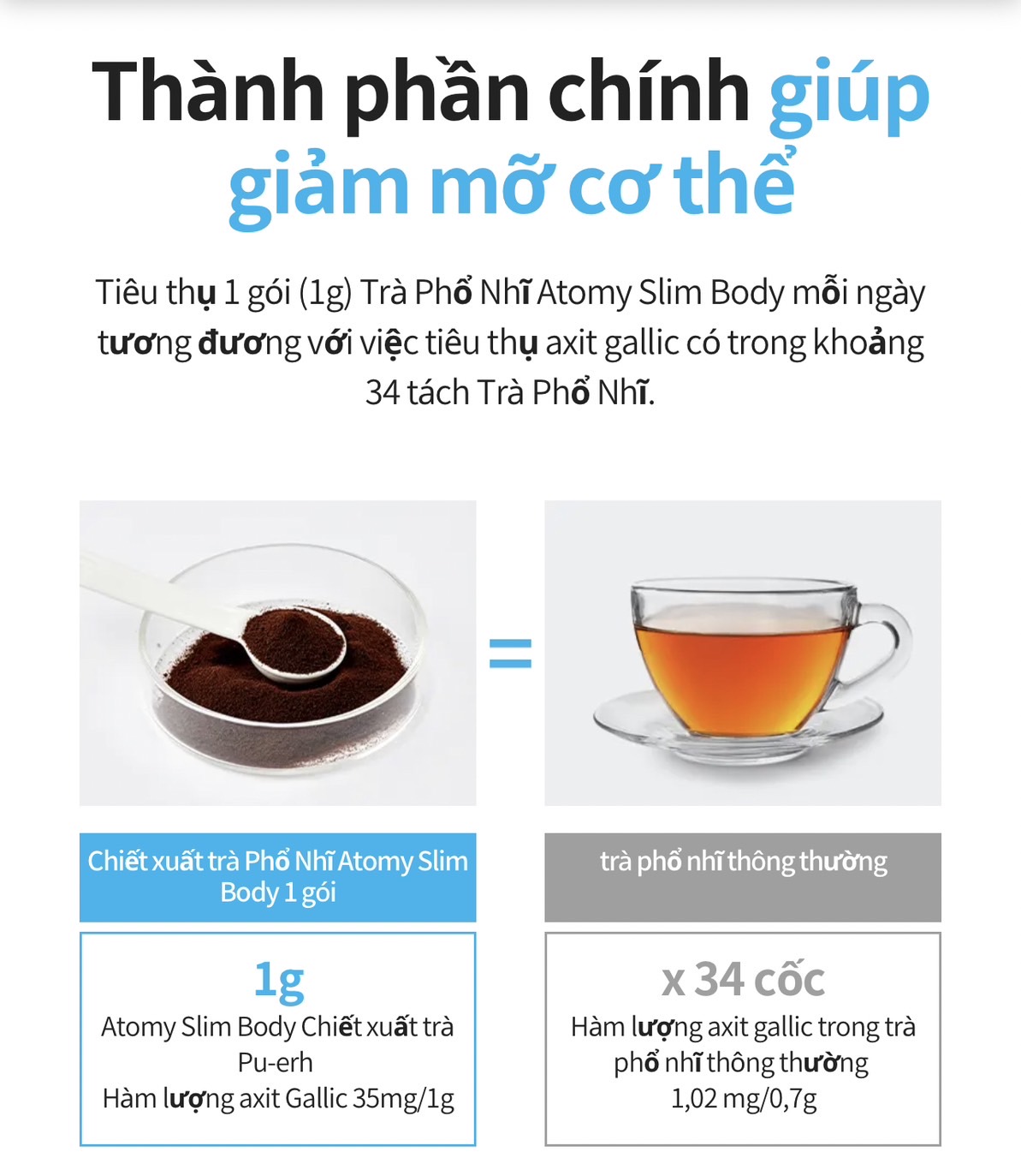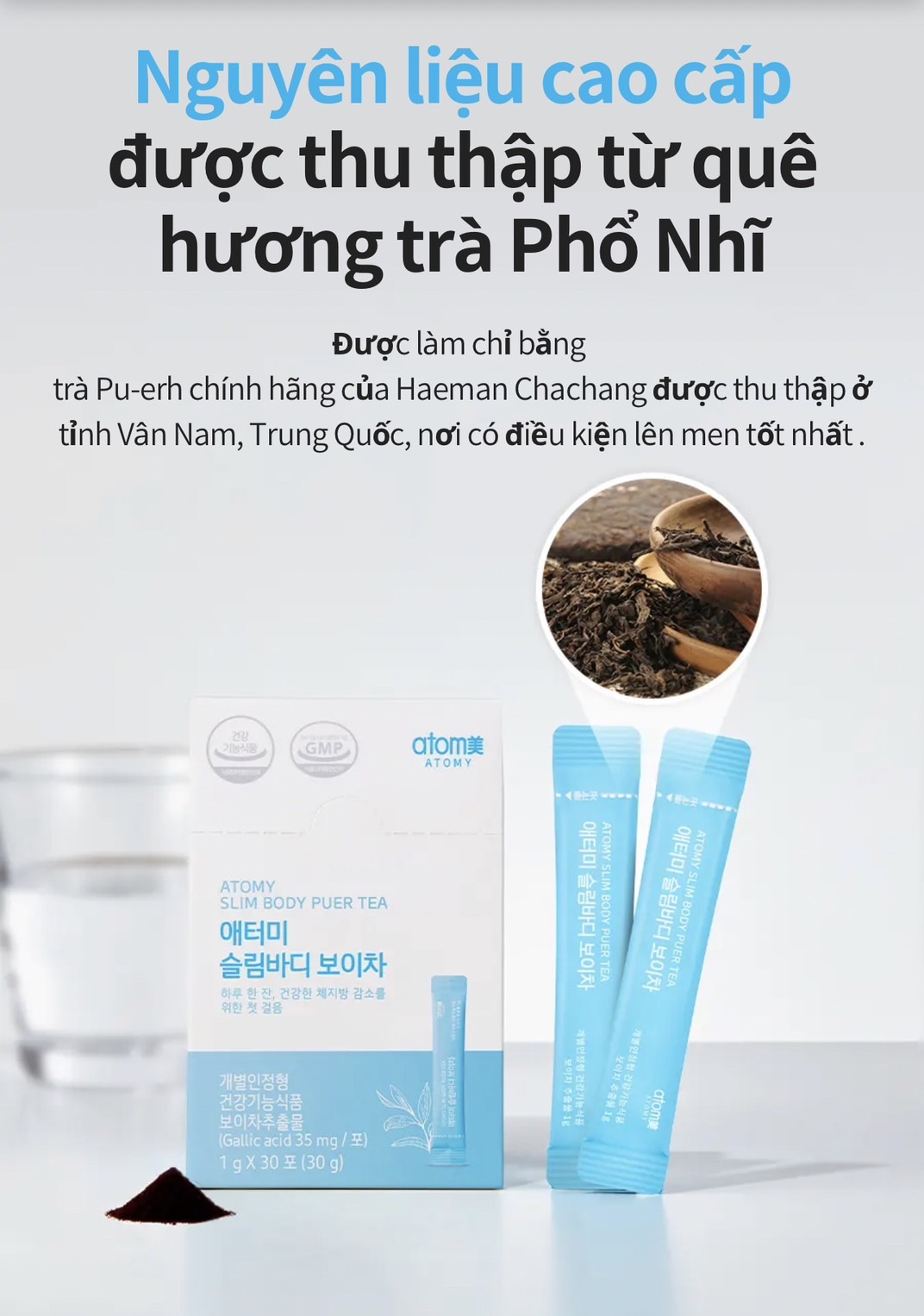 - Trà phổ nhĩ của Atomy được chiết xuất dạng rất cô đặc chỉ cần 1 gói dạng bột đã tương đương 34 tách trà Phổ Nhĩ theo cách pha thông thường.