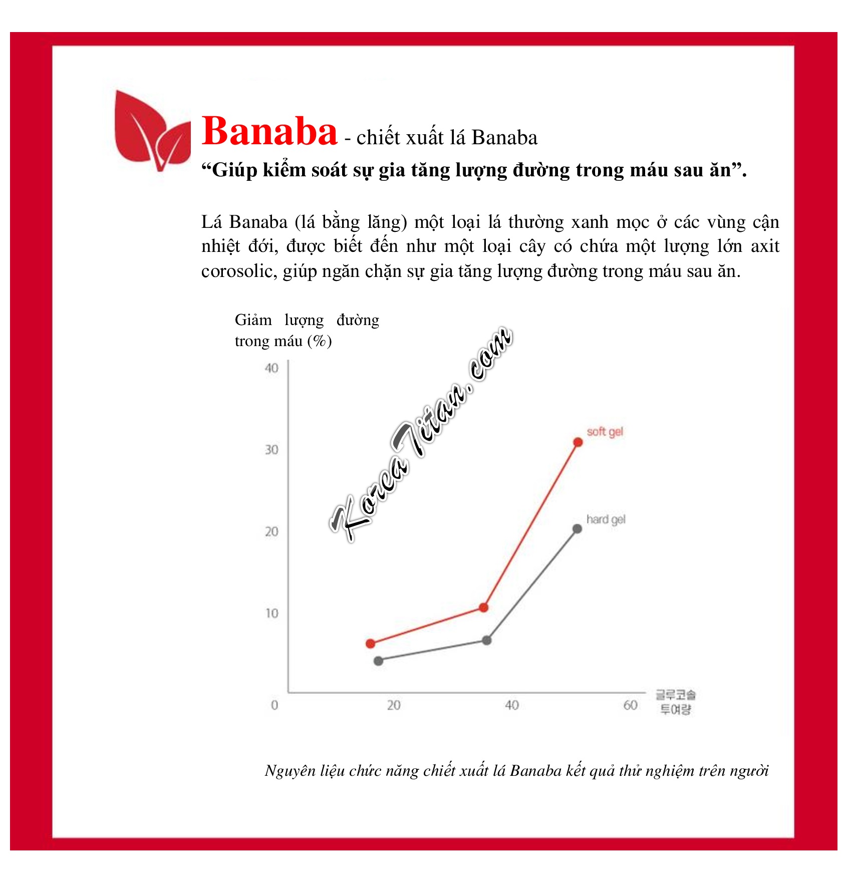 Chiết xuất từ lá banaba: Giúp giảm lượng đường trong máu, thúc đẩy sự tắc nghẽn của các tế bào trong glucose để làm giảm mức đường trong máu. Lá barna có chứa tannin, kali, canxi và magiê, giúp thúc đẩy làm giảm cholesterol và axit mật, giúp ngăn ngừa xơ cứng động mạch, ngăn ngừa ung thư đại trực tràng.
