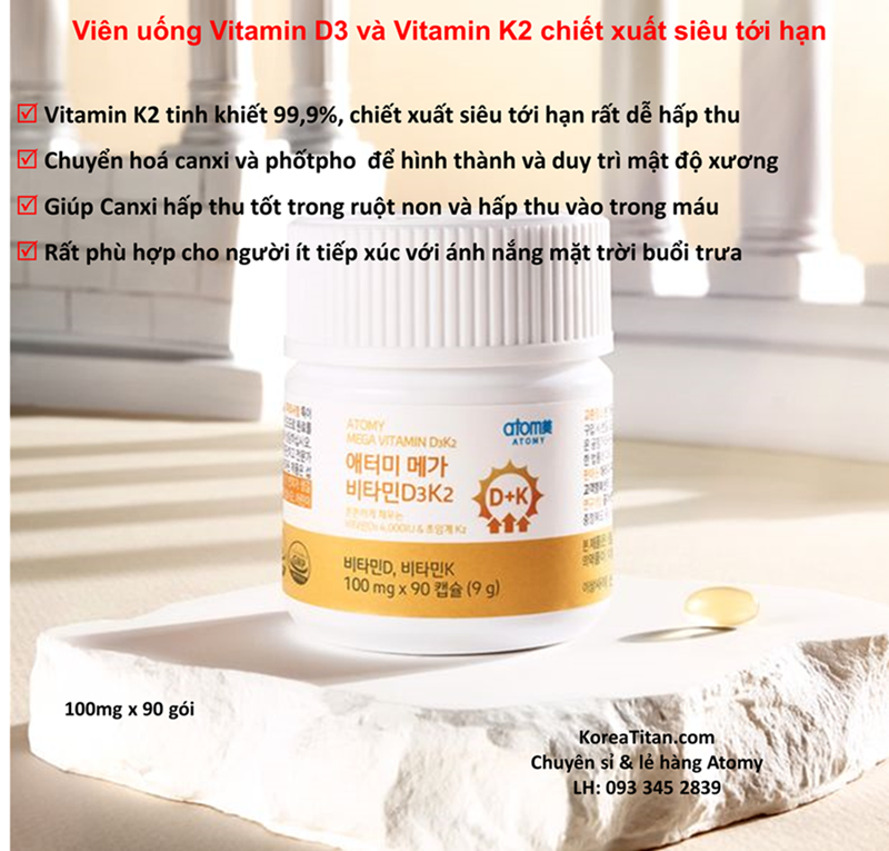 👉 Atomy Mega Vitamin D₃K₂ có D3 4.000 IU + K2 70 µg — là tỷ lệ chuẩn tối ưu, dễ hấp thụ và an toàn khi dùng lâu dài.