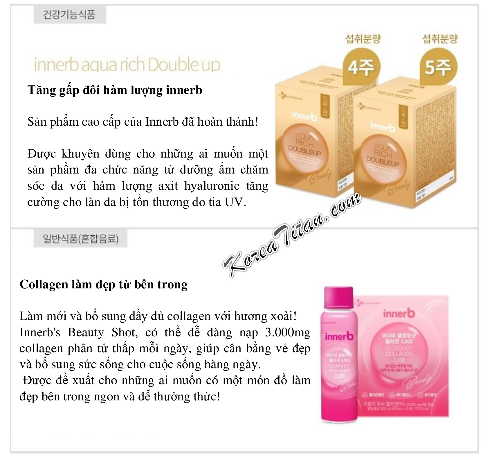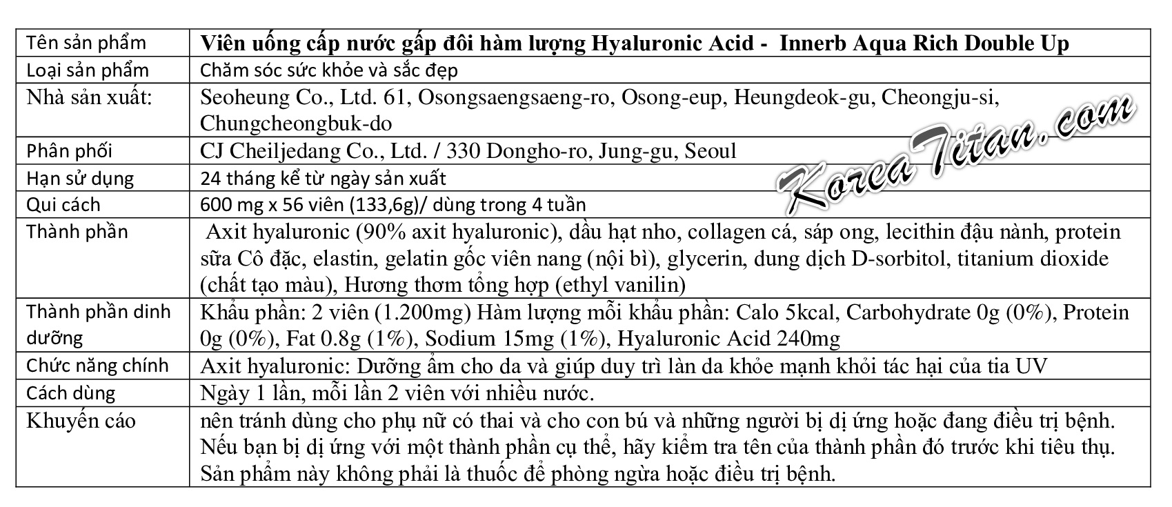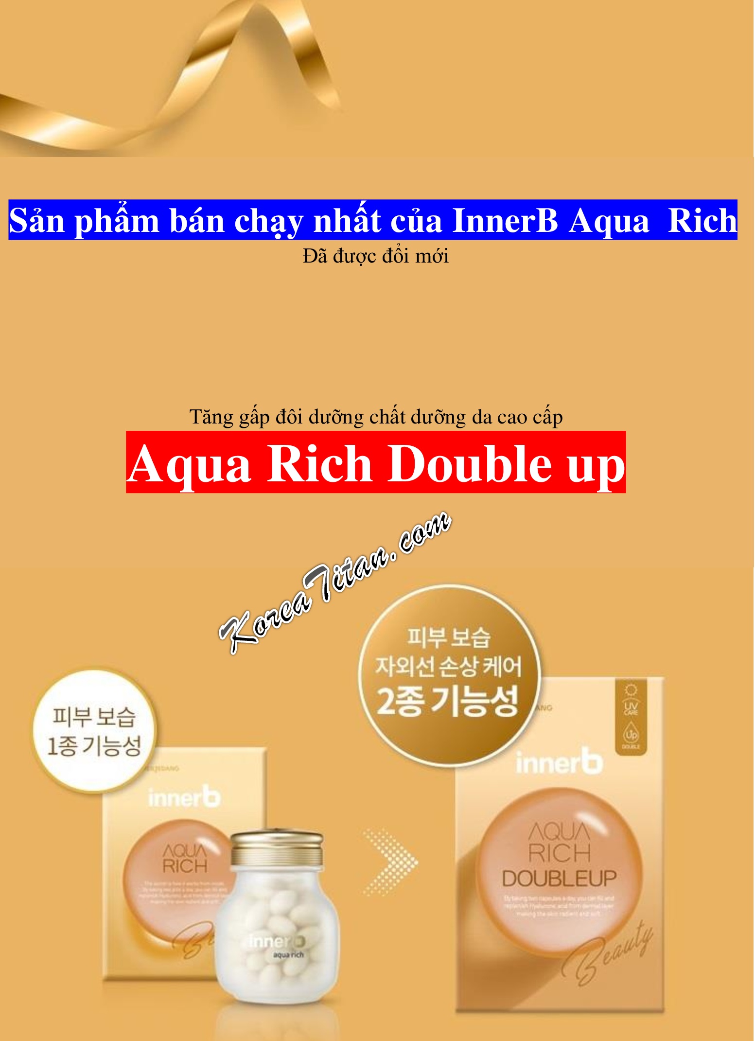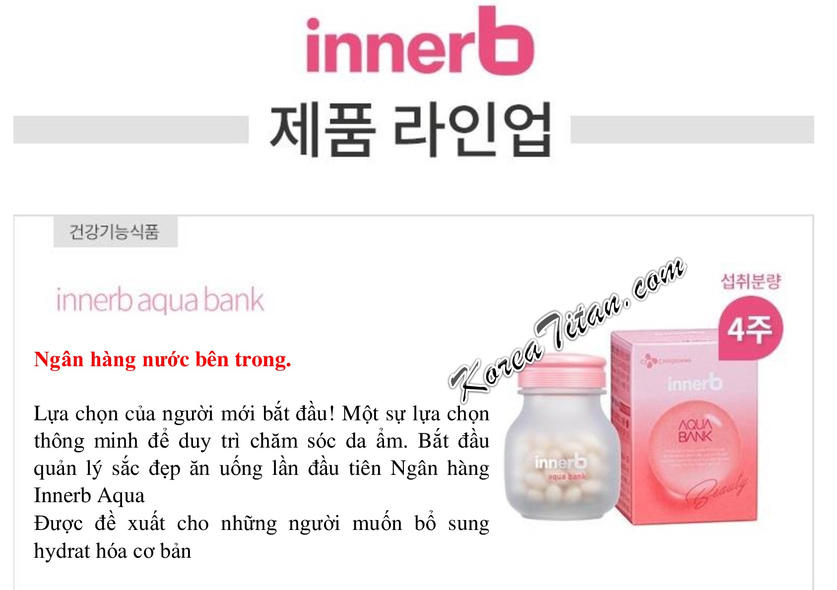✔ Viên uống Innerb Aqua Rich Hàn Quốc bổ sung lượng nước và collagen bị thiếu hụt trong cơ thể, giúp duy trì làn da mịn màng, khỏe mạnh và đàn hồi.