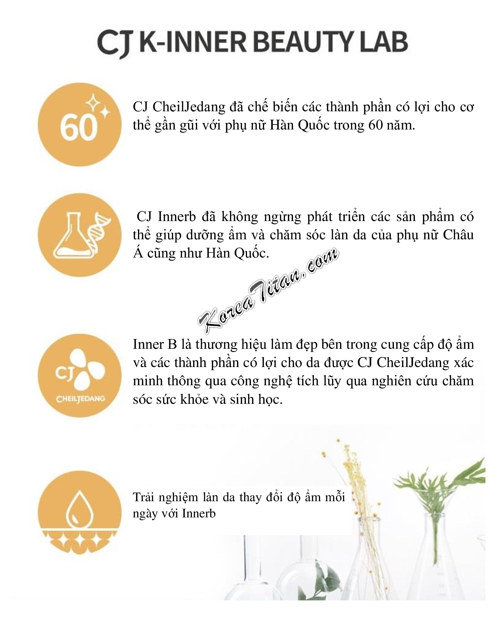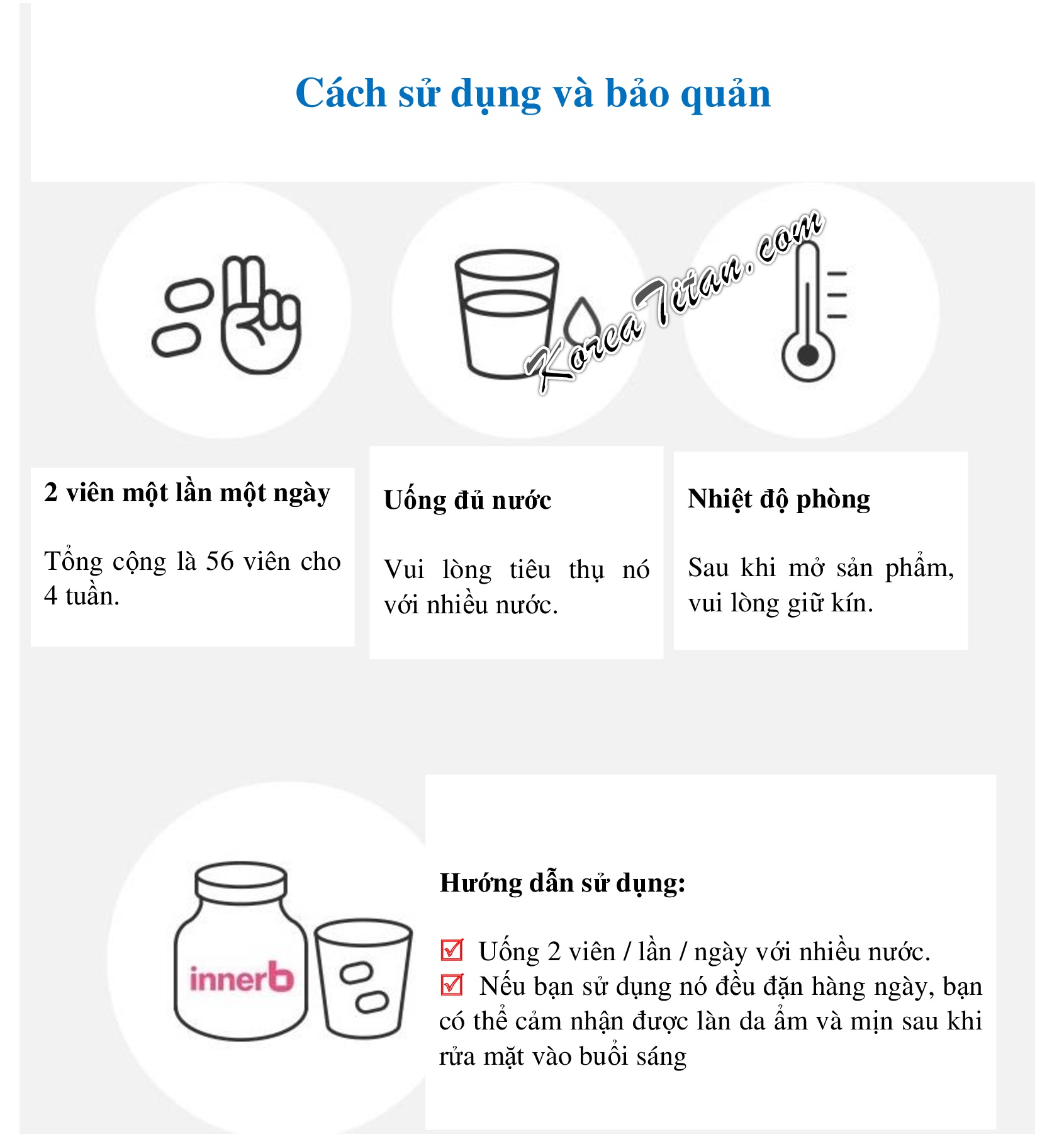 Bạn sẽ không cần mất quá nhiều thời gian để dưỡng da mỗi ngày chỉ cần 2 viên Innerb là đủ. Sản phẩm phù hợp với mọi loại da, đặc biệt là những người sau 25 tuổi, da bị khô ráp, sần sùi, da nhờn, da bị nếp nhăn, kém tươi tắn.