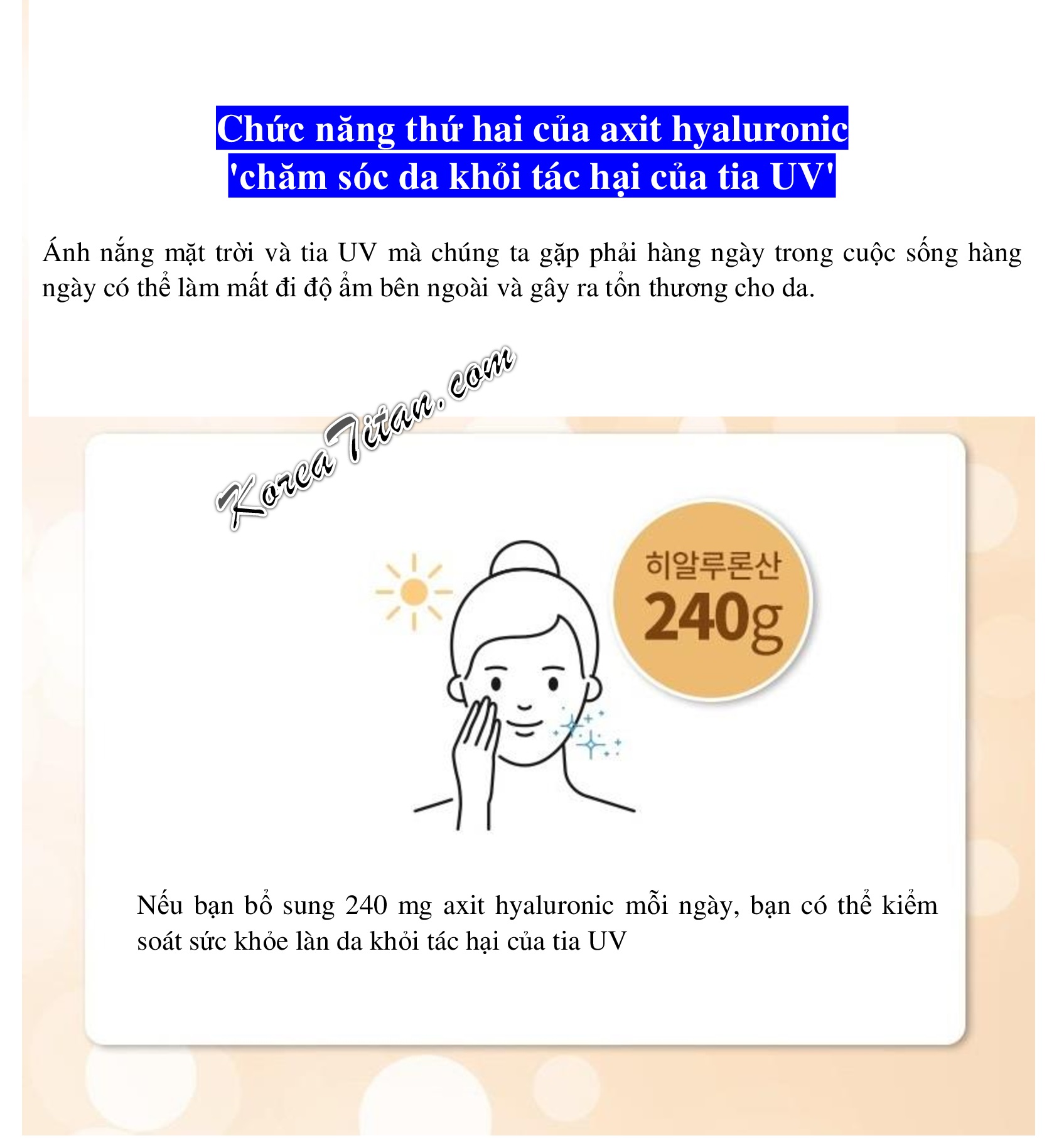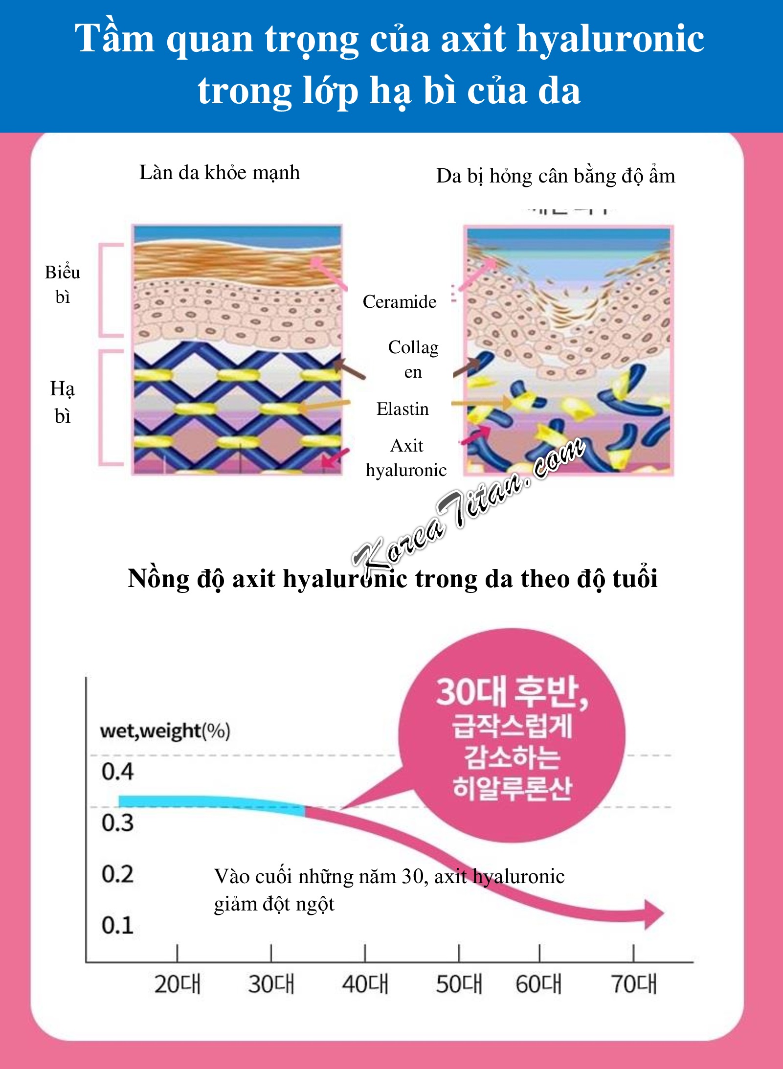 Sự thật thú vị: Khi chúng ta già đi, hàm lượng axit hyaluronic tự nhiên trong da của chúng ta giảm xuống đáng kể. Những người trong độ tuổi từ 19 đến 47 có lượng axit hyaluronic trong da cao gấp đôi so với những người ở độ tuổi 50 và 60. Khi chúng ta bước vào độ tuổi 70, lượng đó còn giảm hơn nữa, làm cho các chất bổ sung axit hyaluronic càng trở nên quan trọng hơn, vì chúng giúp thay thế những gì da mất đi theo thời gian (và tất nhiên, tác hại của ánh nắng mặt trời tích lũy sẽ đẩy nhanh quá trình này và các quá trình lão hóa da khác) .