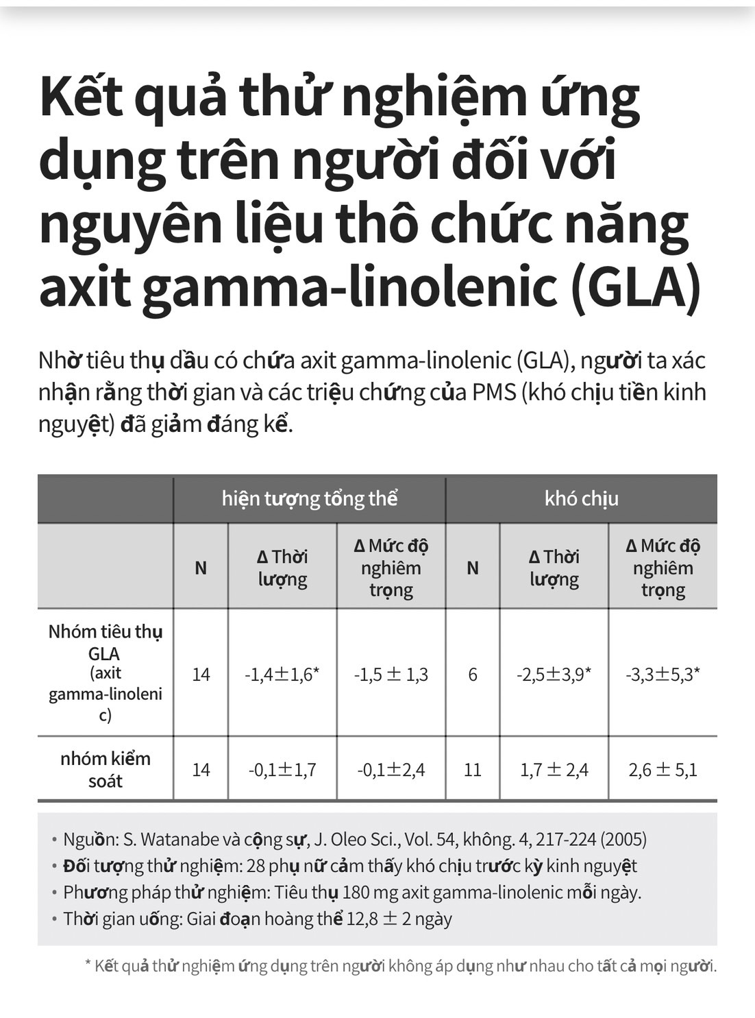 GLA (Gamma Linolenic Acid) là một loại axit béo thiết yếu, cơ thể sử dụng GLA để sản sinh ra một loạt các prostaglandin như prostaglandin E1 (PGE1) có chức năng kiểm soát sưng, đau, huyết áp, cân bằng chất lỏng, đông máu, sản sinh hormone và hoạt động của hormone nội tiết tố nữ.