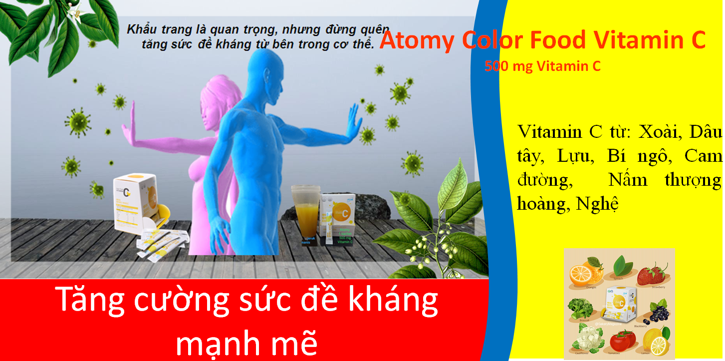 ✅ Atomy Color Food Vitamin C cung cấp Vitamin C thiết yếu cho cơ thể với thành phần gồm 7 loại thực vật chứa nhiều vitamin C trong tự nhiên : Xoài, Dâu tây, Lựu, Bí ngô, Cam đường, Nấm thượng hoàng, Nghệ