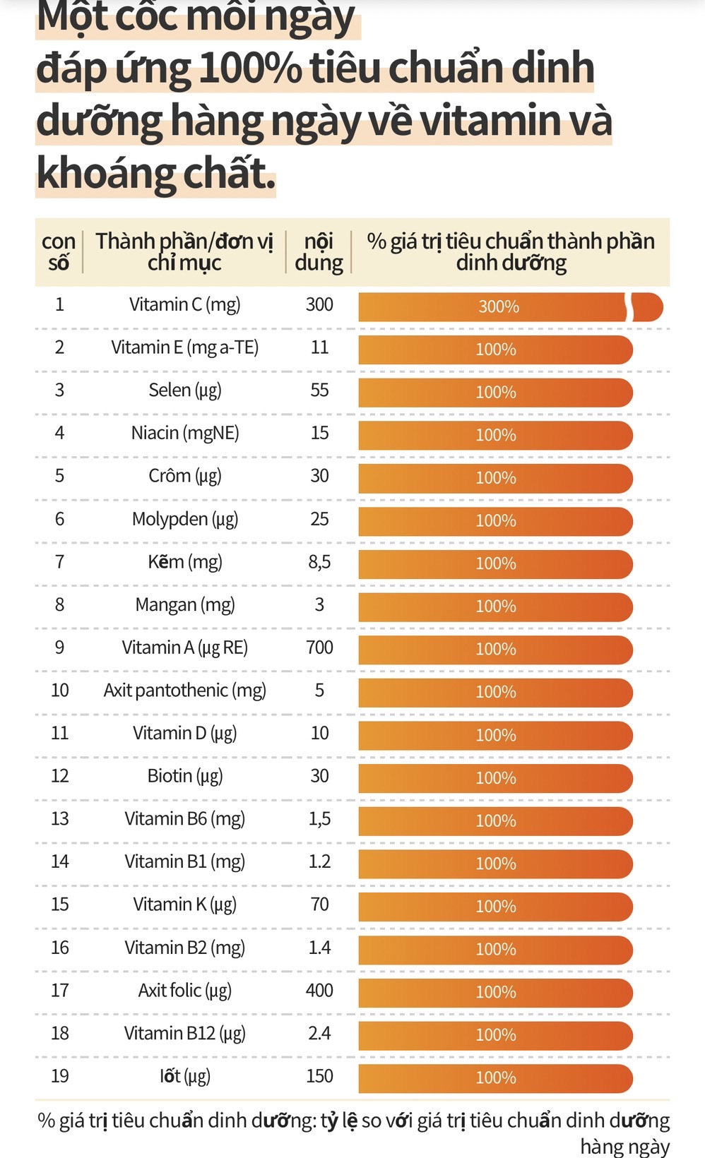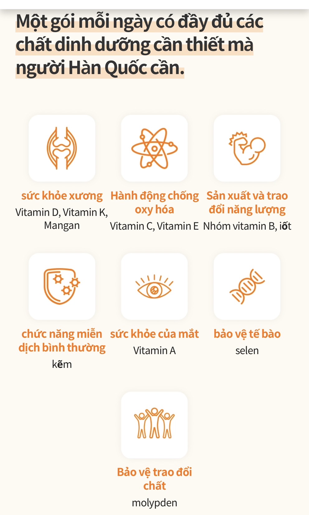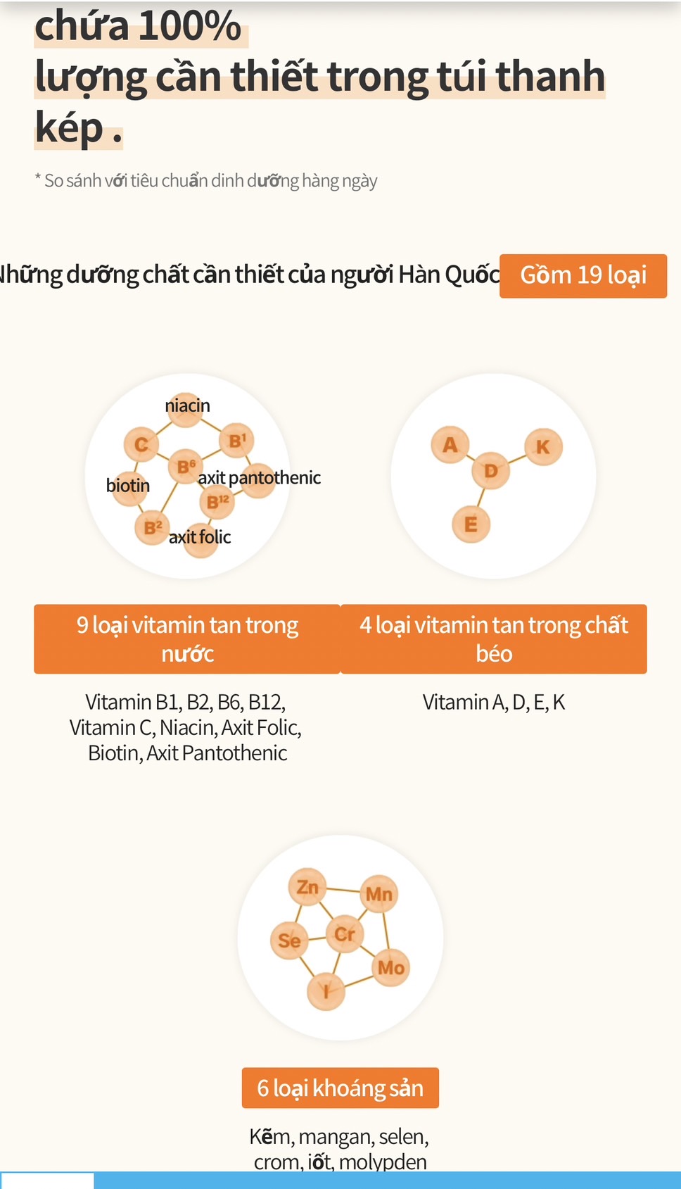 Cung cấp 19 loại dưỡng chất thiết yếu cần thiết cho người Hàn Quốc, 13 loại vitamin, 6 loại khoáng chất (*đáp ứng 100% tiêu chuẩn dinh dưỡng hàng ngày).